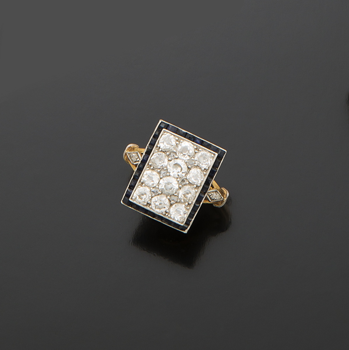 BAGUE en or jaune 18K, ornée d'un motif rectangulaire serti de douze diamants ronds de taille ancienne dans un entourage de petits saphirs calibrés.