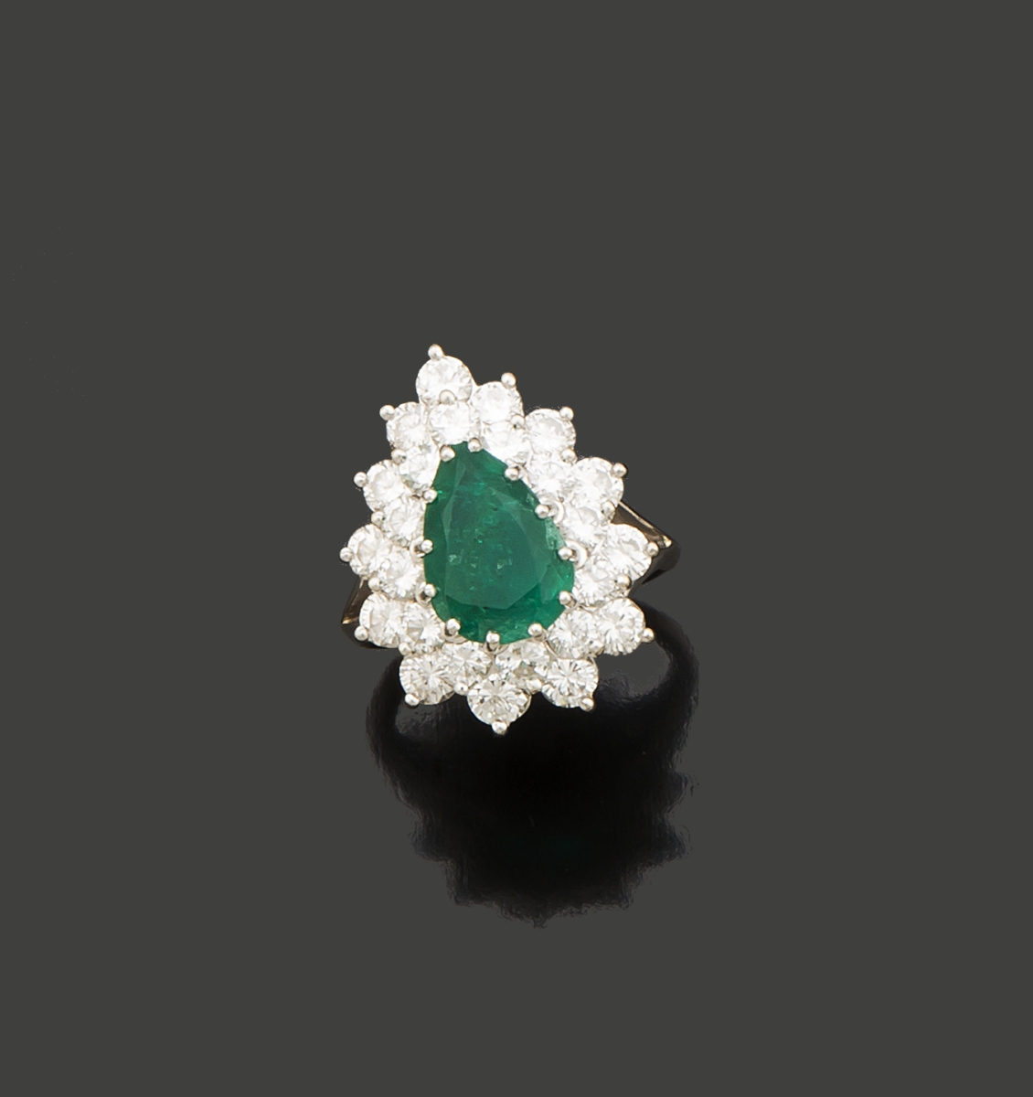 BAGUE en or gris 18K et platine, ornée d'une émeraude de forme poire dans un double entourage de vingt-cinq diamants ronds de taille brillant.