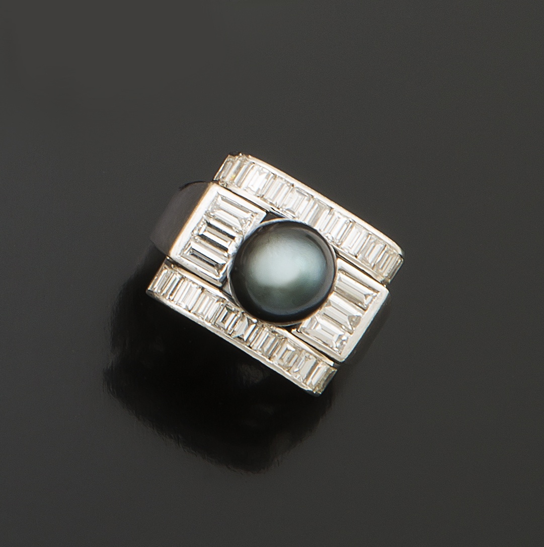 BAGUE en or gris 18K de forme géométrique, ornée au centre d'une perle de culture grise de Tahiti, dans un entourage de diamants rectangulaires.