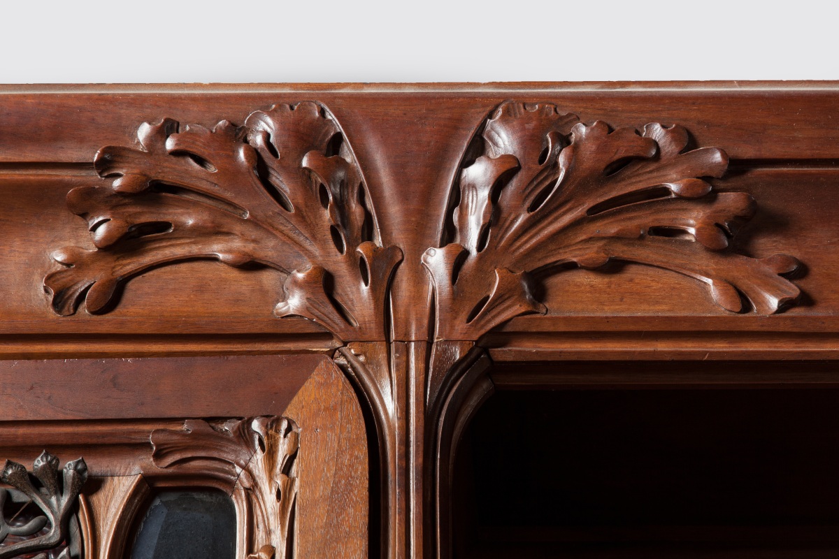 La BIBLIOTHÈQUE ouvre par trois portes vitrées, surmontées chacune d'un verre moulé coloré imitant les ondoiements marins. La porte centrale à vitre compartimentée et glace biseautée est surmontée d'une niche ouverte. Les portes latérales protègent des casiers. Les tablettes intérieures sur crémaillère sont amovibles.