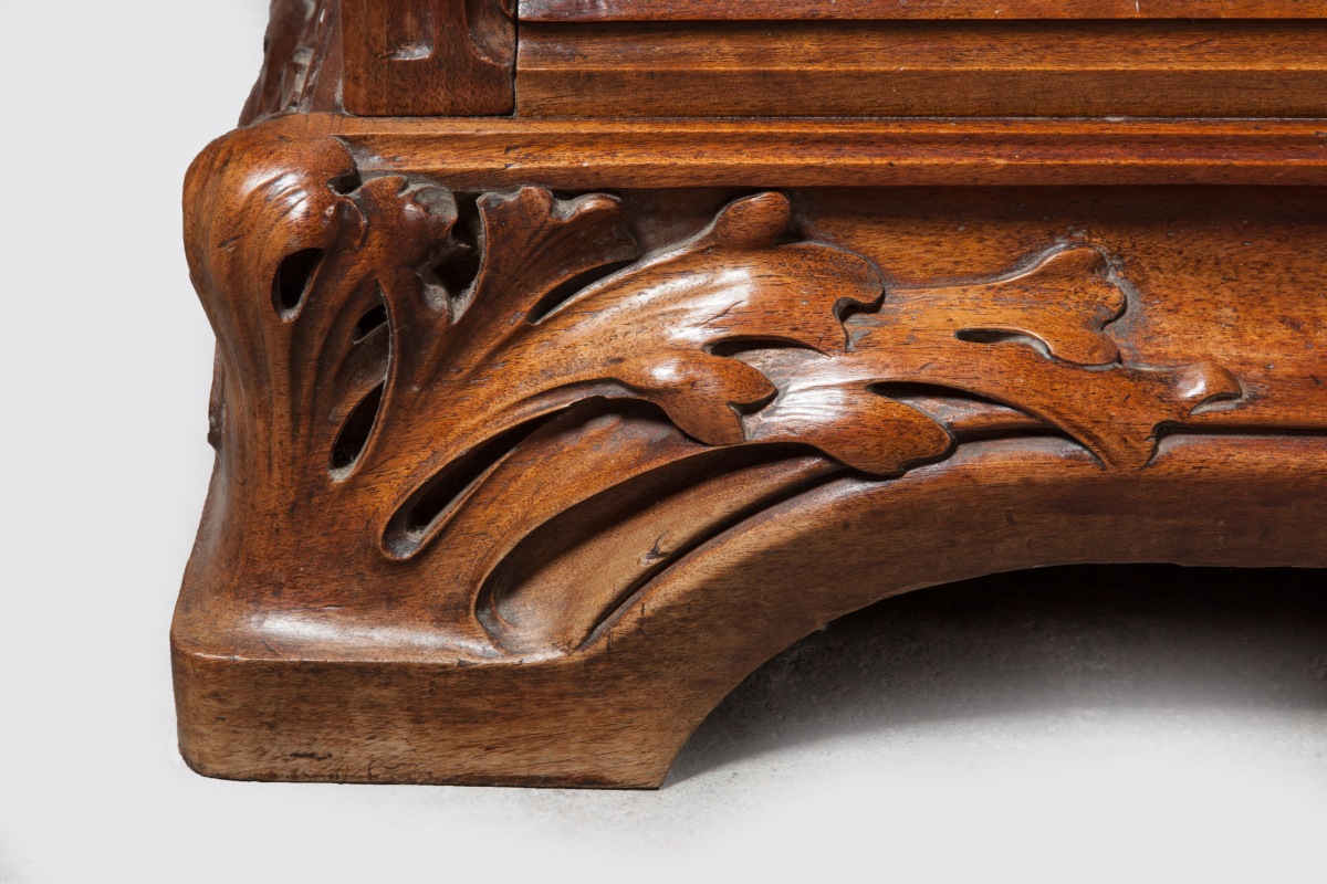 Le BUREAU À CAISSONS est flanqué de tablettes latérales débordantes, à la façon d'un vaisseau. Son plateau rectangulaire est gainé de cuir fauve gaufré et protégé par une vitre. Il ouvre en façade par quatre tiroirs dans les caissons. Il repose sur quatre montants galbés, sculptés d'algues en relief. Poignées de tirage en bronze doré.