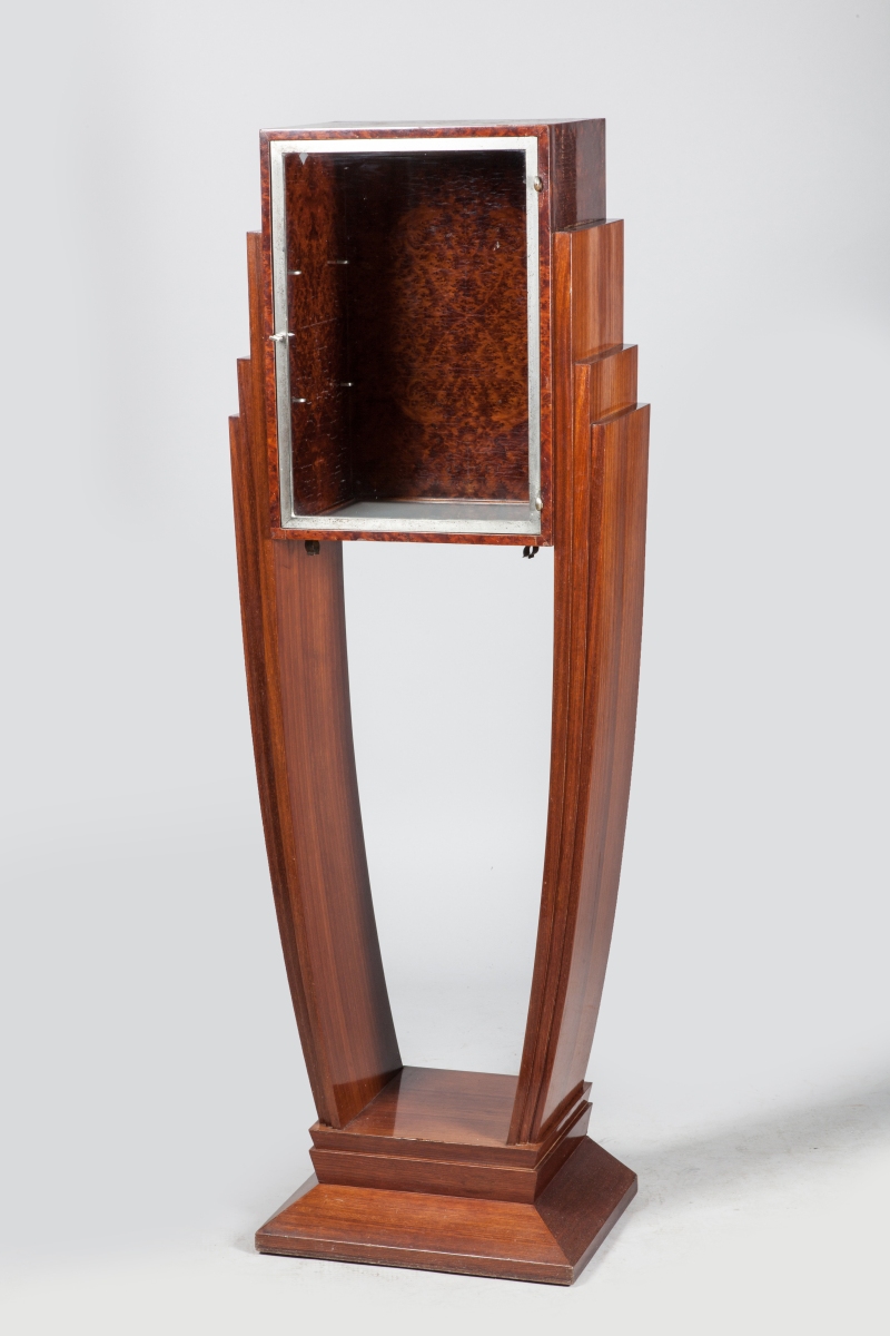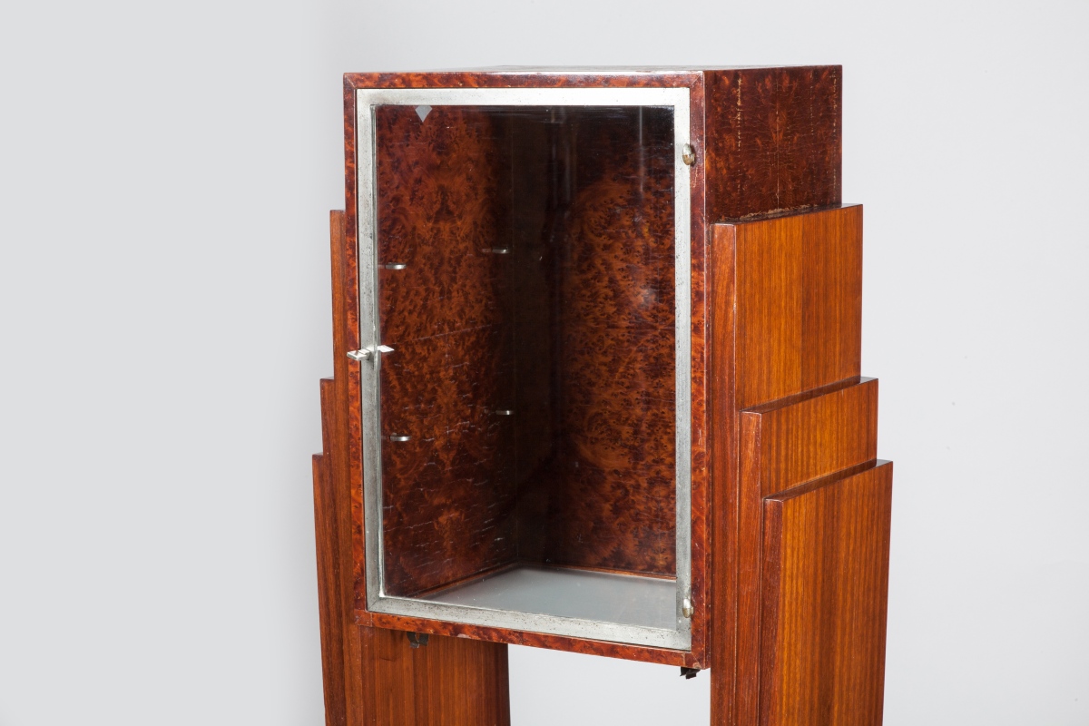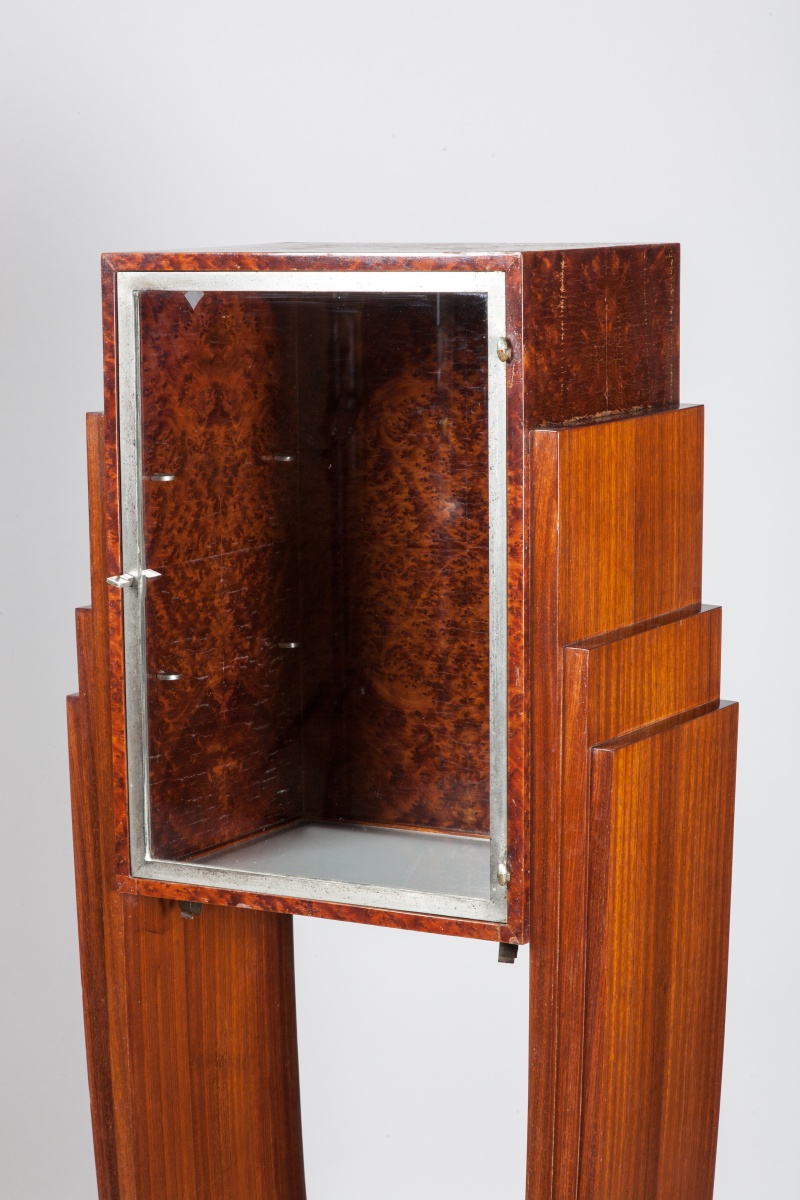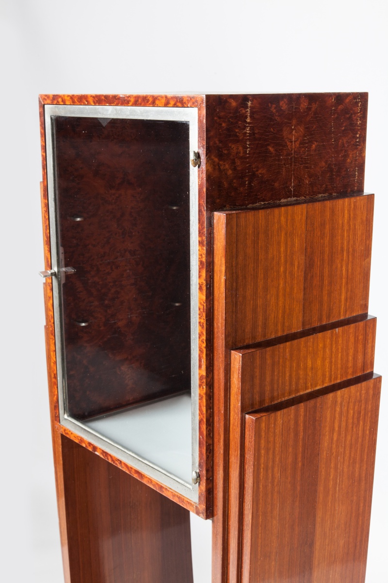en placage d'acajou sapelli et loupe de thuya en forme de psyché. La porte vitrée de la vitrine de forme rectangulaire en bronze argenté (chromé). Les montants à trois gradins allant en se resserrant vers une base quadrangulaire à pans obliques.
