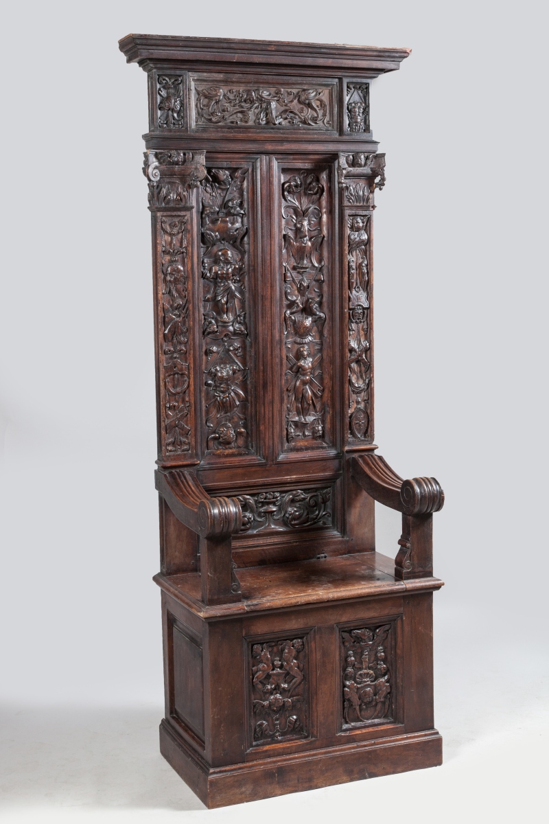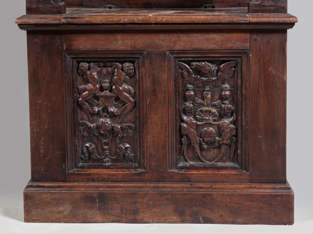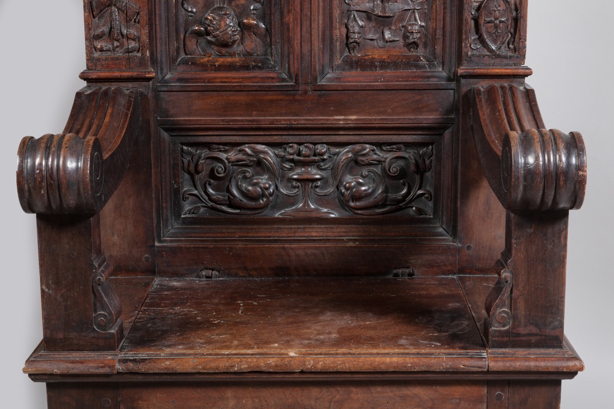 Dossier richement sculpté de volutes feuillagées, bestiaire monstrueux, trophées d'armes. Deux pilastres à chapiteau composite. Accotoirs à enroulement moulurés. Assise rectangulaire sculptée en façade formant coffre.