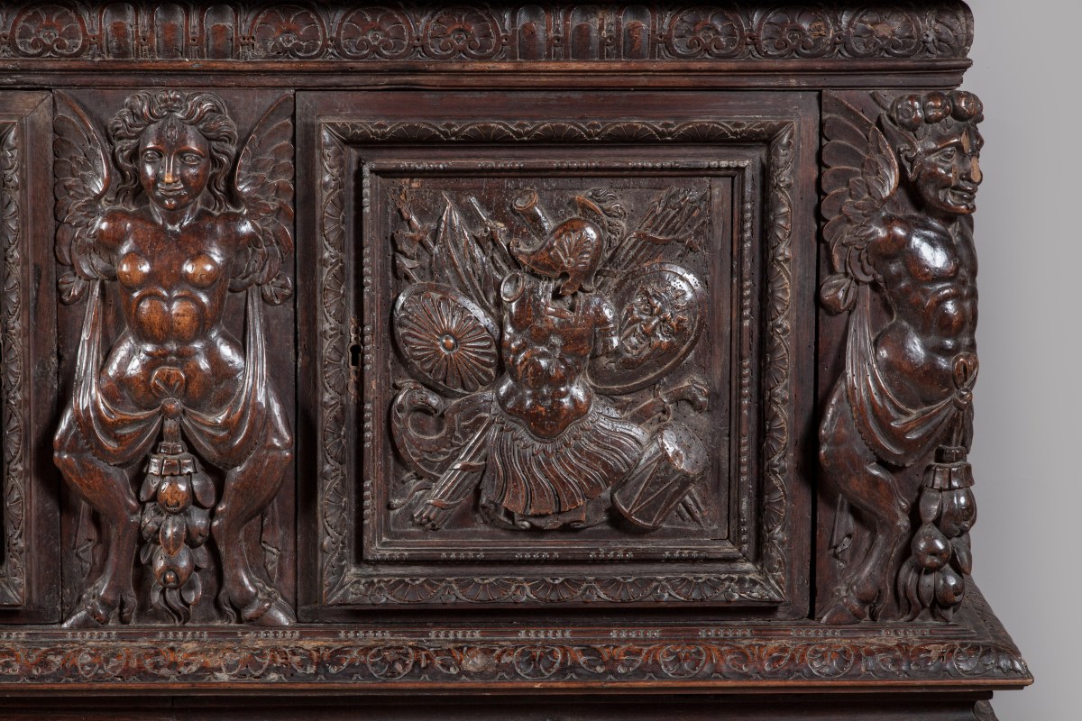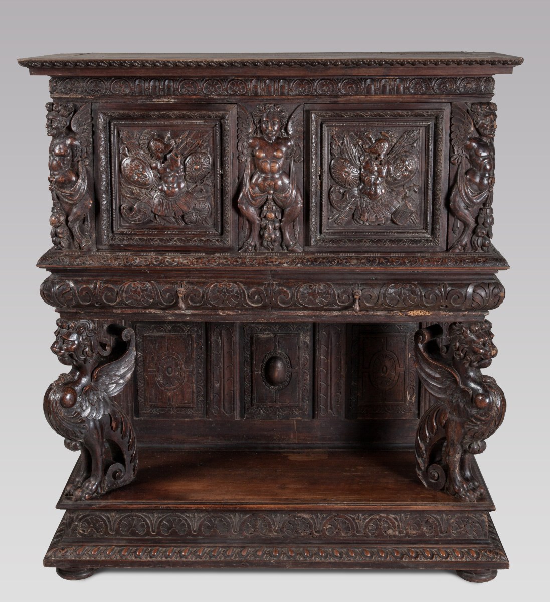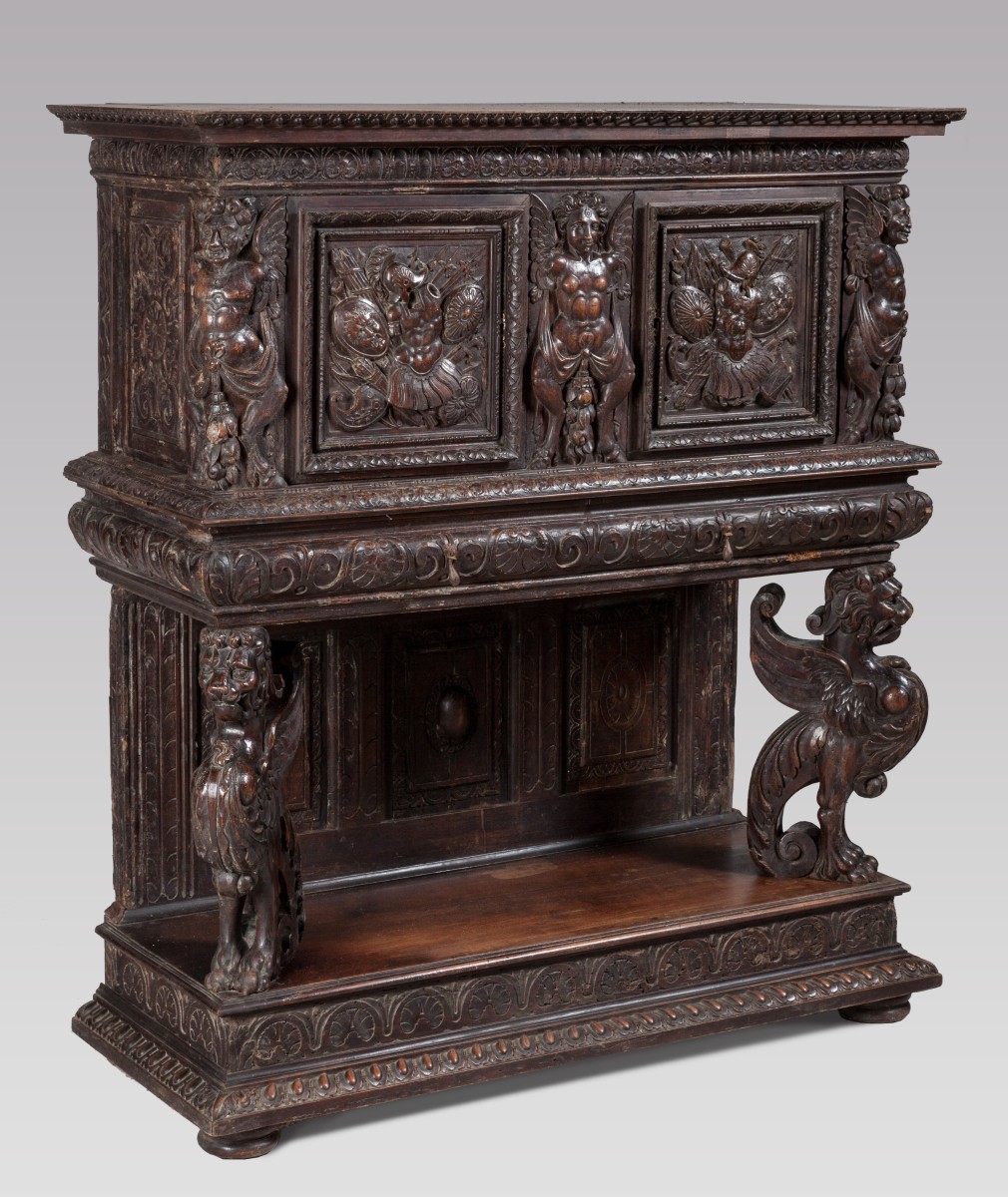 Meuble original, il semble cependant interprété à partir d'une proposition de dressoir de Jacques Androuet du Cerceau (voir illustration). Les deux panneaux du corps supérieur s'ornent de trophées, la figure centrale se tasse en un personnage ailé semi accroupi, les termes latéraux remontent et deviennent sur le corps supérieur des faunes contorsionnés alors que les sphinges centrales glissent sur les côtés, pivotant à 45° pour s'aligner sur les faunes.