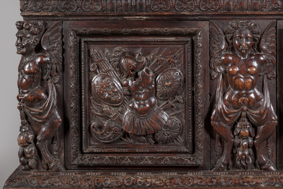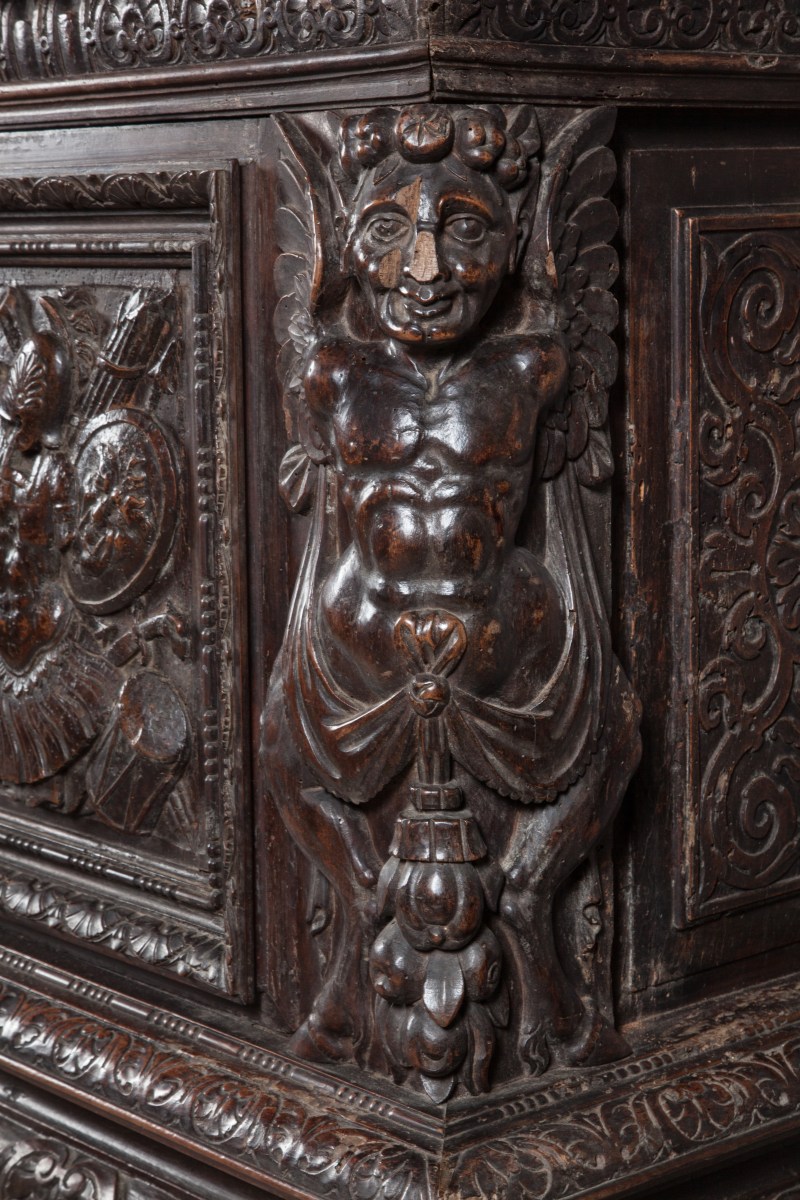 DRESSOIR AUX CHIMÈRES. Meuble deux corps en noyer au décor sculpté de panneaux, en partie inférieure en retrait - à motifs d'oves et godrons. Il ouvre à deux vantaux en corps supérieur sculptés de trophées: cuirasses, boucliers, faisceaux, lances, drapeaux, heaumes et glaives. Figure centrale entre les portes de personnage ailé semi accroupi. Montants fantasmagoriques et supports exceptionnels de faunes, chimères et harpies.