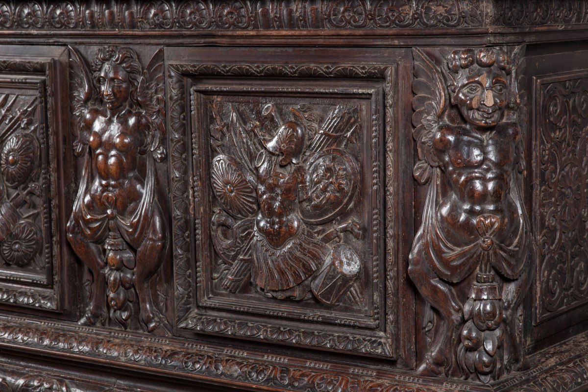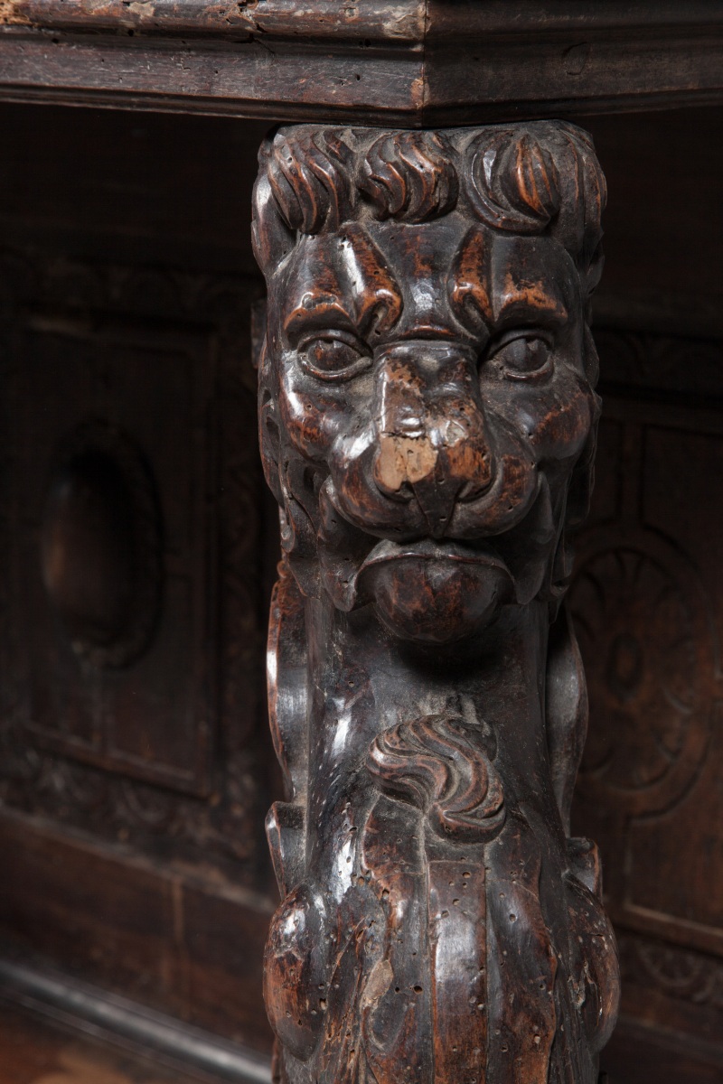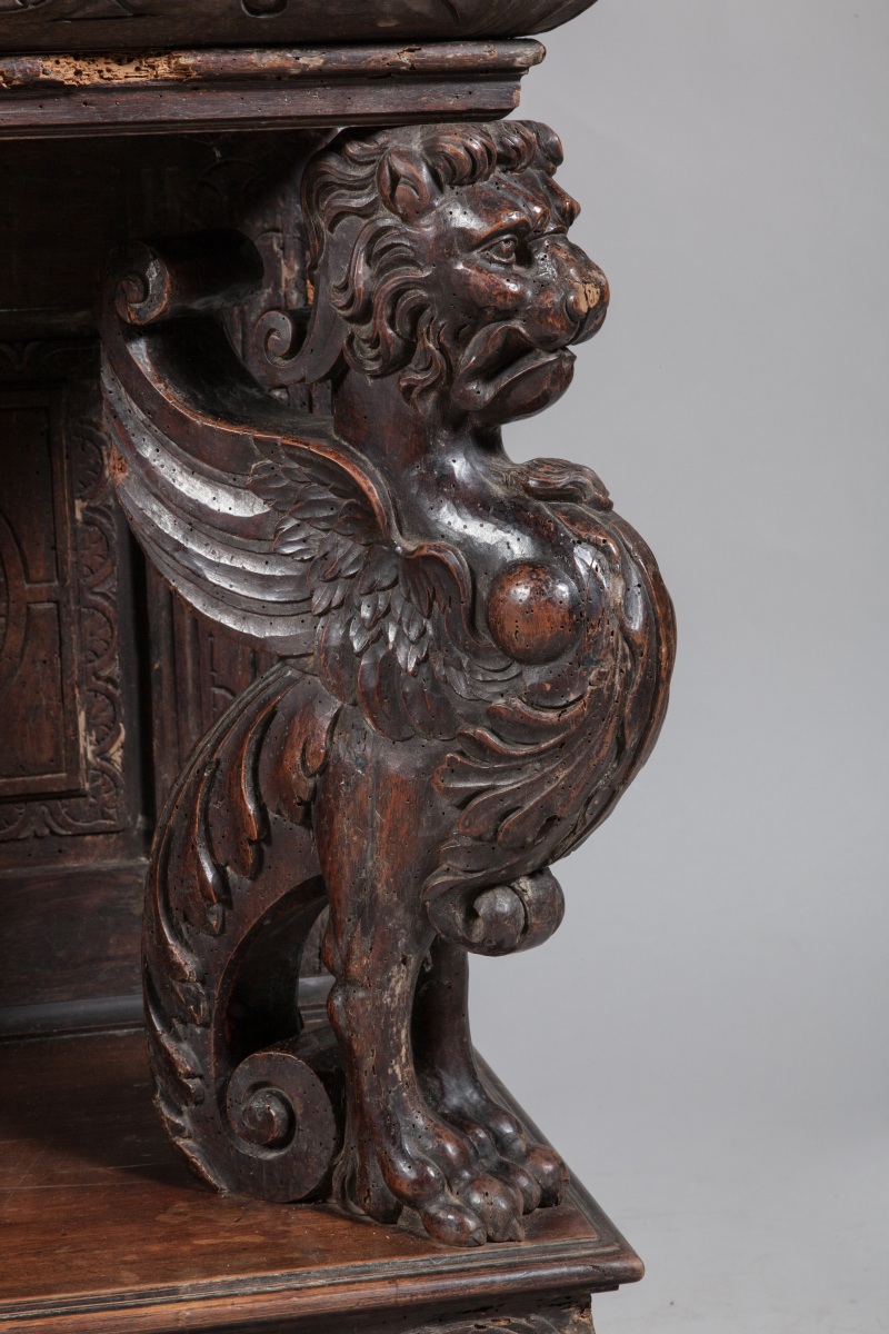 Les chimères sont à rapprocher de celles d'une table d'apparat en noyer conservée au Louvre. (Legs de Charles-Antoine-Benoït Rochard, 1903, inv. OA. 5940). Dressoir de Jacques Androuet du Cerceau. Le mobilier du Moyen Age et de la Renaissance, 1998. Hugues Sambin, 1989.