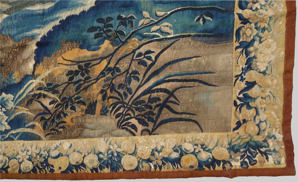 Tapisserie verdure en laine. Bordure à fleurs et à fruits.