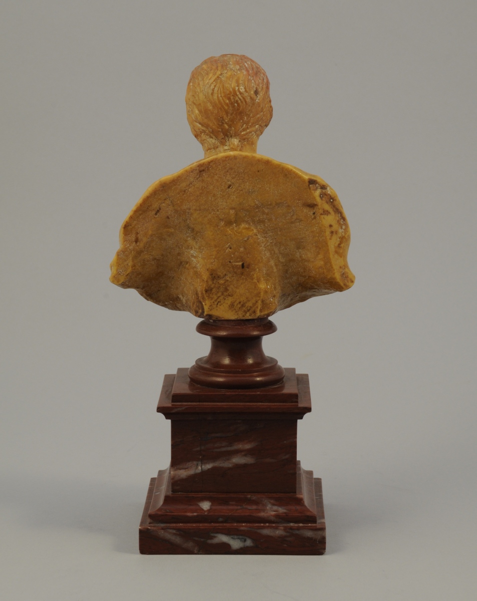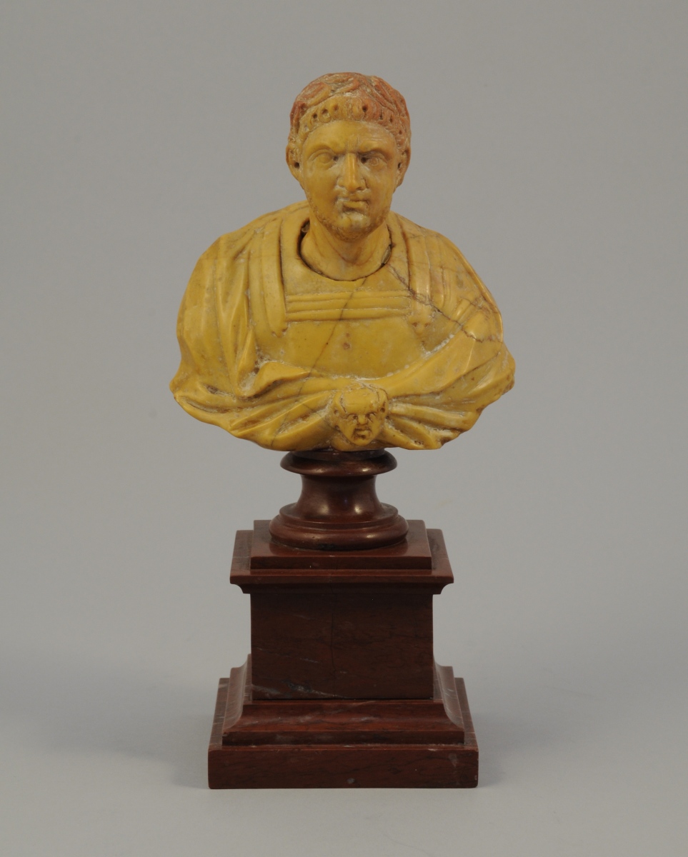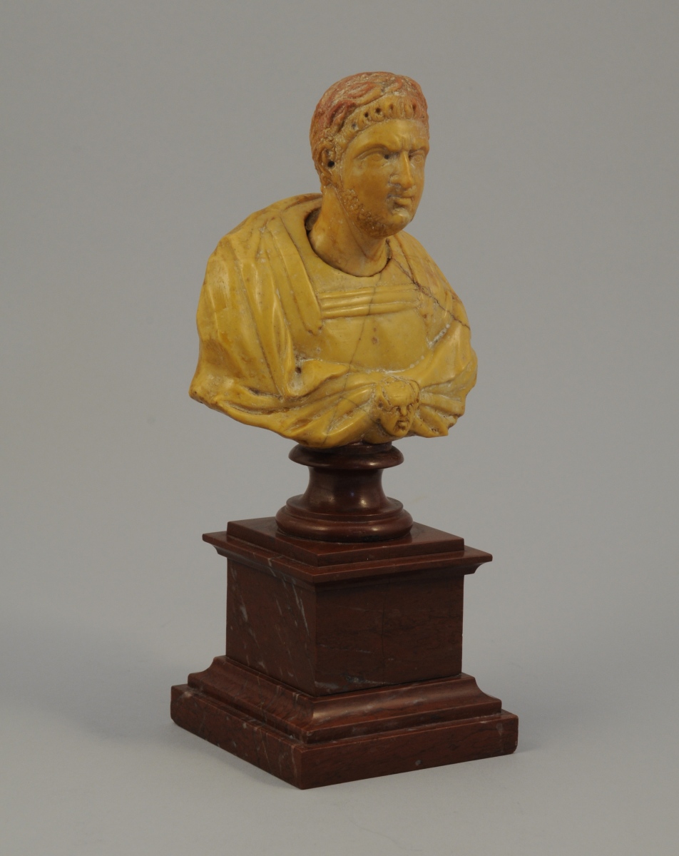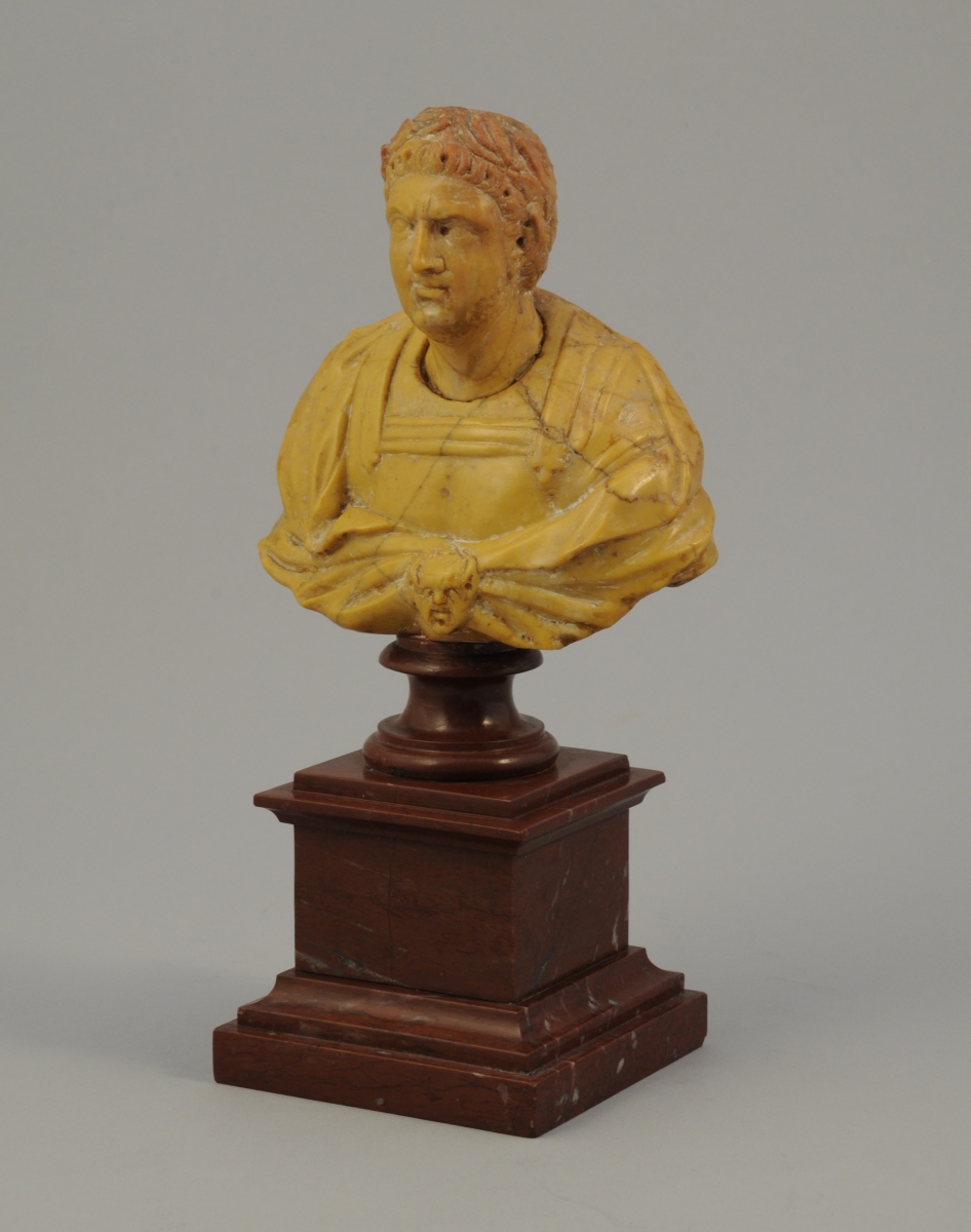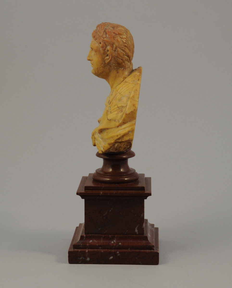 BUSTE d'EMPEREUR ROMAIN en pierre calcaire sculptée et montée postérieurement sur un socle de marbre rouge.