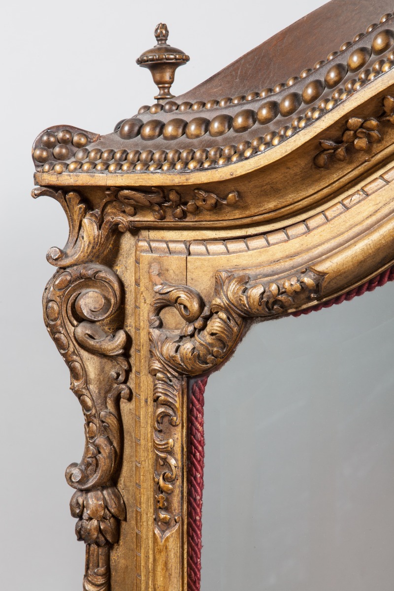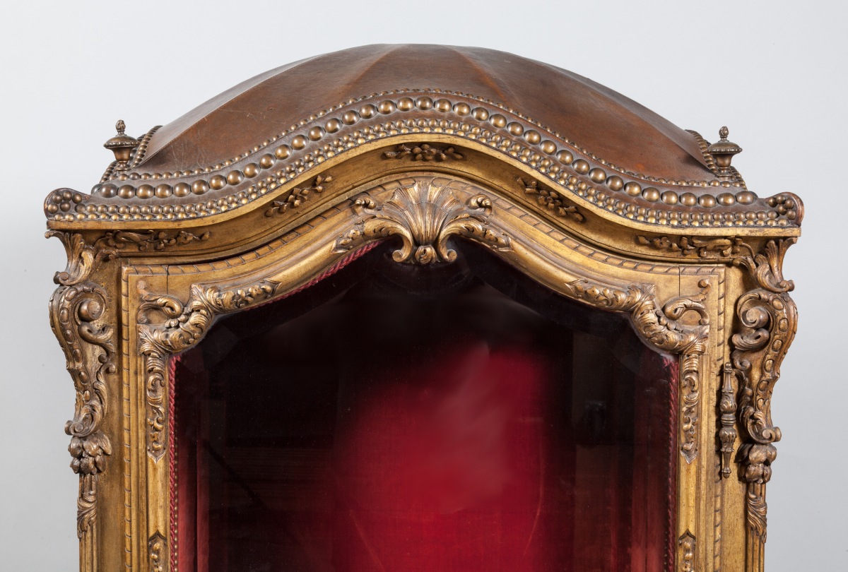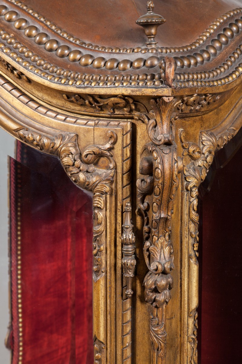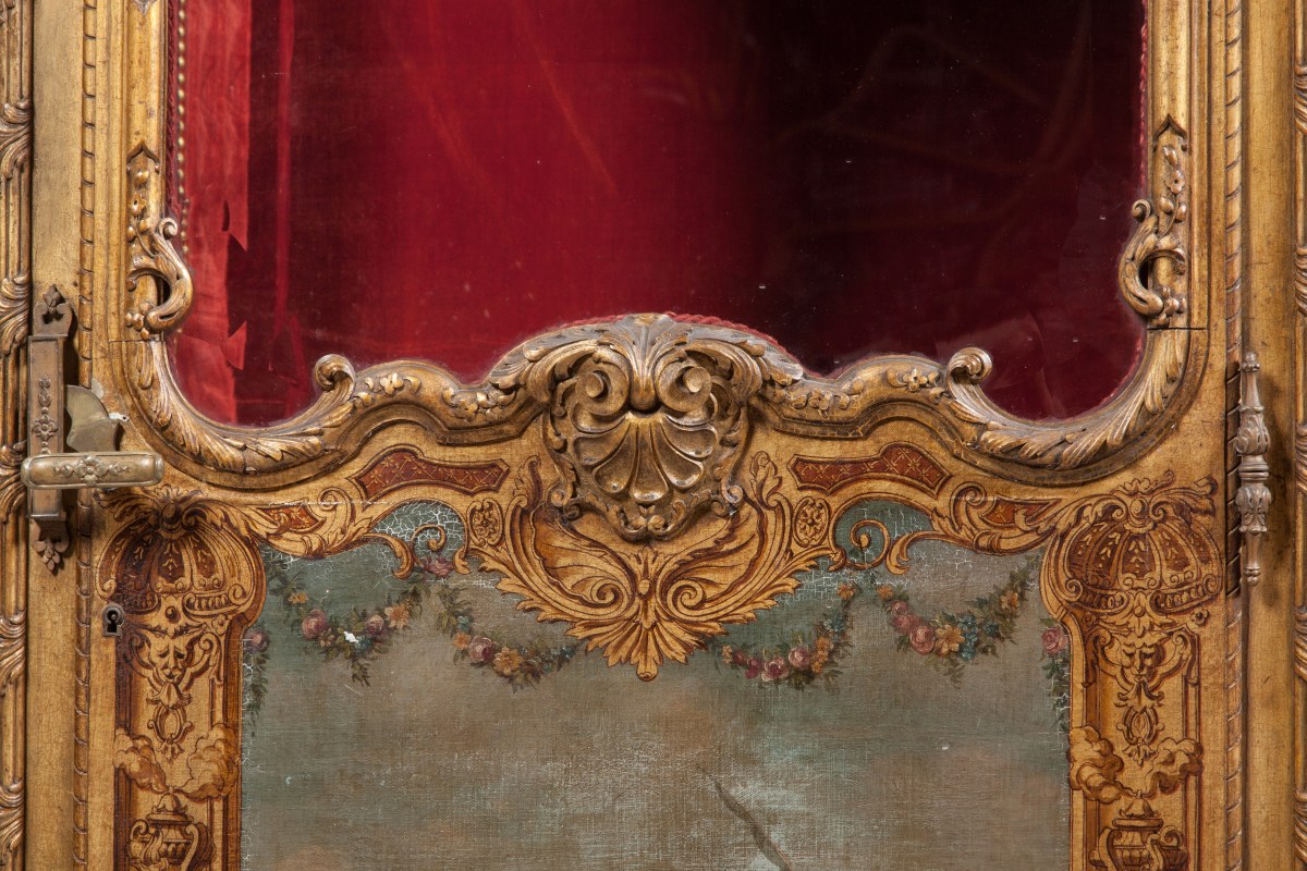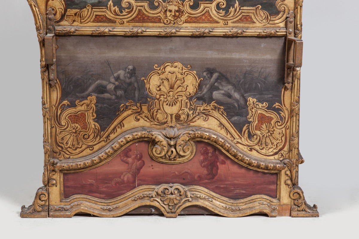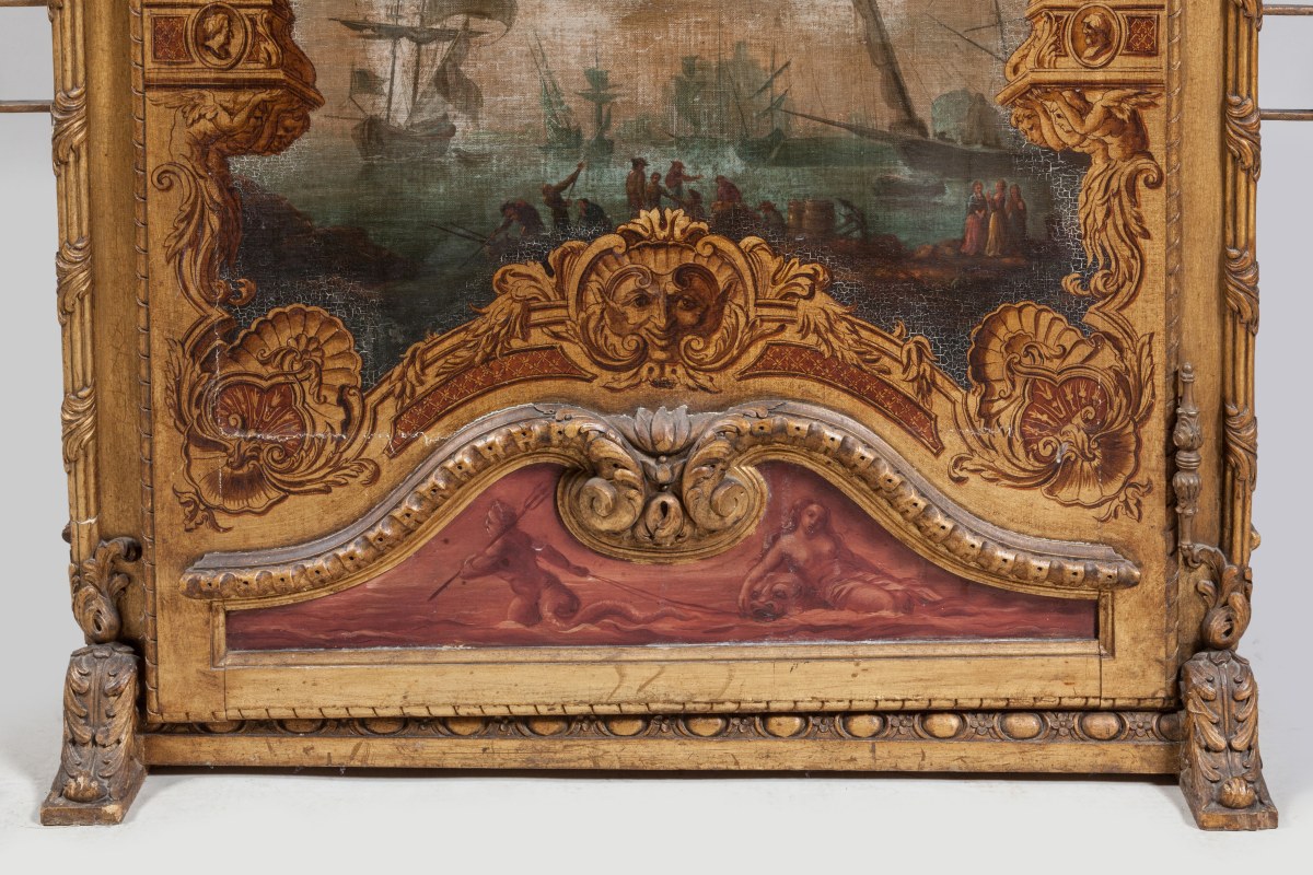 CHAISE À PORTEURS AUX MARINES en bois richement sculpté, stuqué et doré de motifs rocaille. Les panneaux des côtés et de la porte peints de scènes portuaires, de batailles navales, de tritons et autre dieux fleuves en camaïeu dans un entourage virtuose en trompe l'œil, dans le goût d'Adrien Manglard. Les portes et côtés sont garnis de verres biseautés, l'intérieur est capitonné de velours cramoisi, avec des accotoirs à franges rouges. Le dessus gainé de cuir est surmonté de quatre toupies.