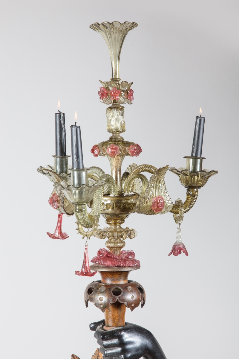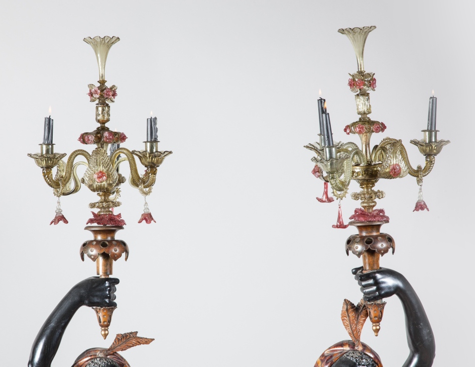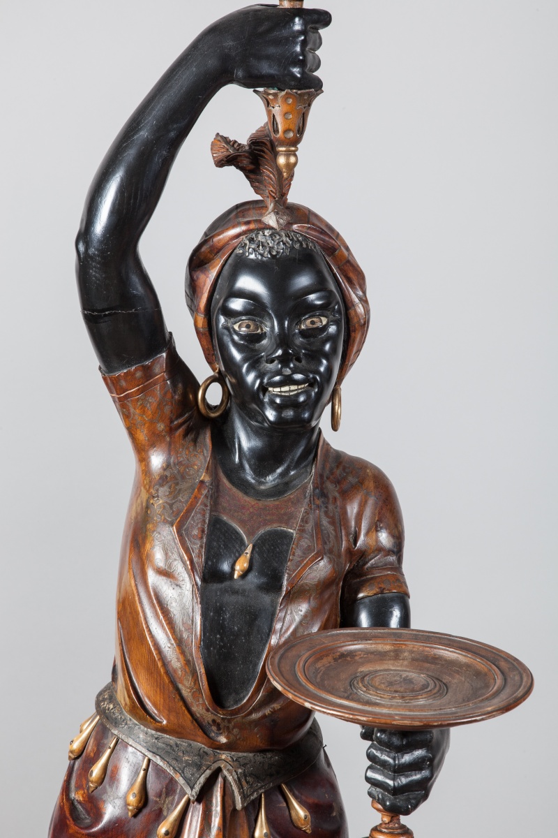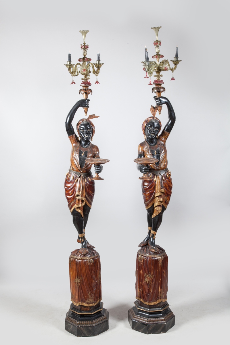 en bois sculpté, doré et peint. Coiffés d'un turban à plumet et vêtus d'une tunique drapée, ils tiennent une coupe à piédouche d'une main et un candélabre de l'autre. Les candélabres à trois lumières en verre de Murano vert et ornements floraux roses. Le binet central reçoit un cornet. Chaque personnage repose sur un socle de forme octogonale sculpté en bas relief d'un drapé et peint en partie supérieure.