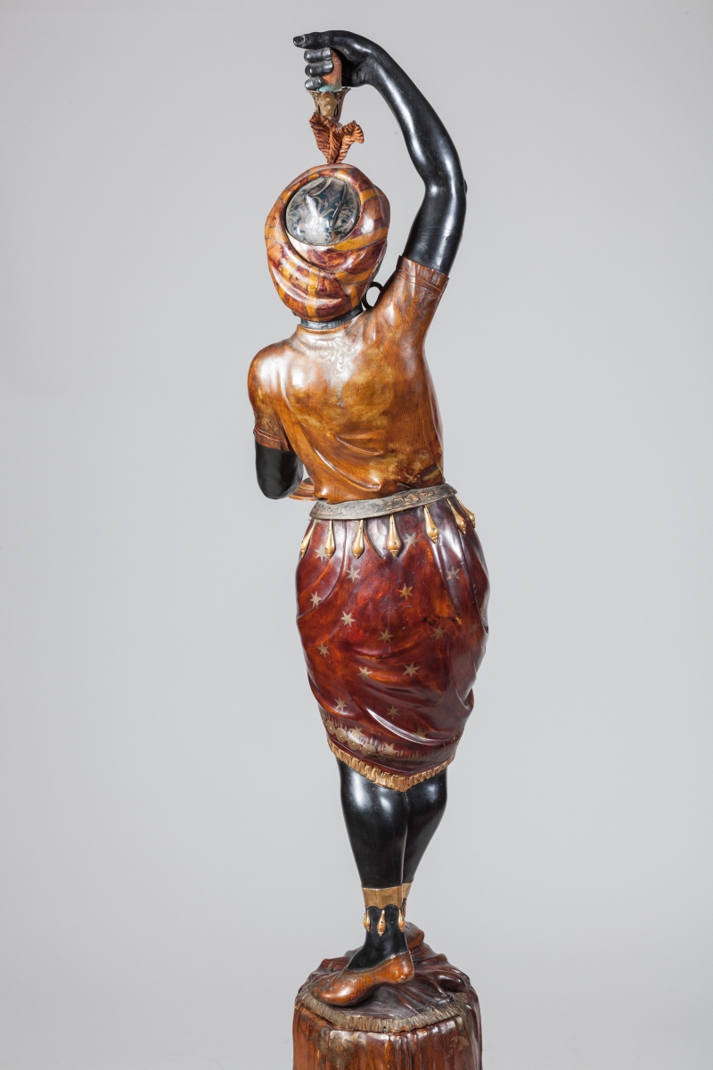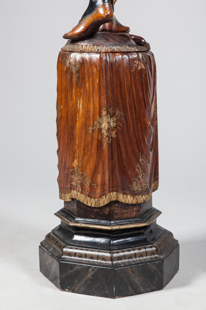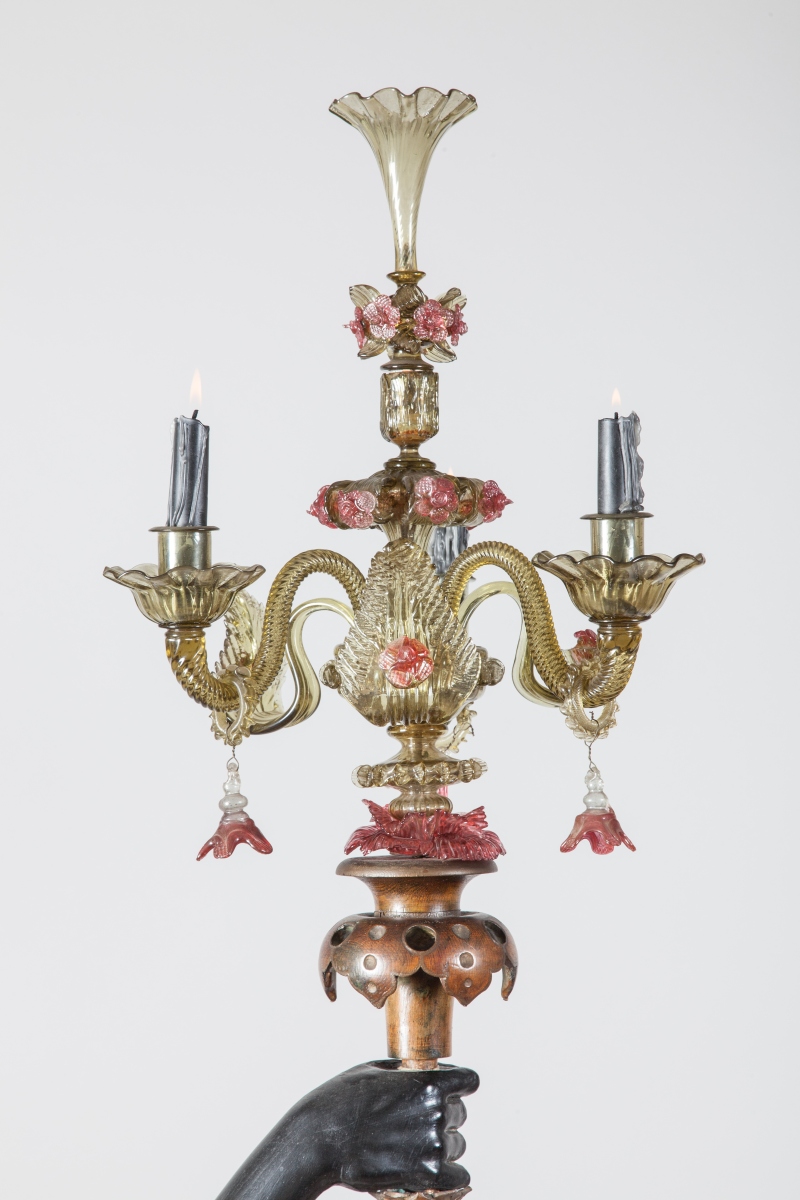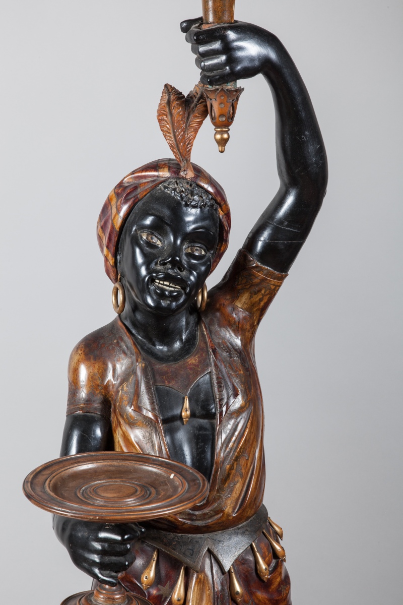 en bois sculpté, doré et peint. Coiffés d'un turban à plumet et vêtus d'une tunique drapée, ils tiennent une coupe à piédouche d'une main et un candélabre de l'autre. Les candélabres à trois lumières en verre de Murano vert et ornements floraux roses. Le binet central reçoit un cornet. Chaque personnage repose sur un socle de forme octogonale sculpté en bas relief d'un drapé et peint en partie supérieure.
