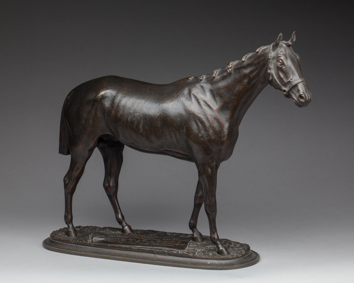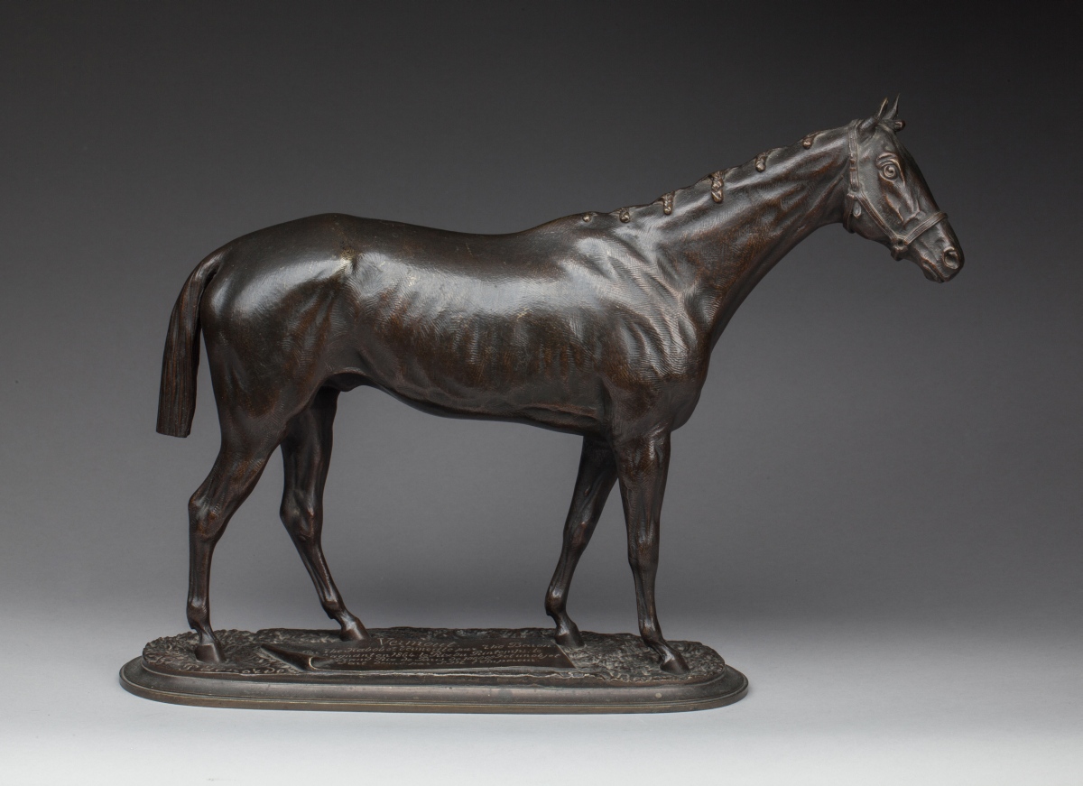 Bronze patiné, signé P. Lenordez et V. Boyer, titré sur un cartouche et légendé: "Par The Nabot et Vermeille par The Baron. gagnant en 1864 le Prix du Printemps le Grand Prix de Paris de 100 000 F. et un objet d'art donné par S.M. l'Empereur".
