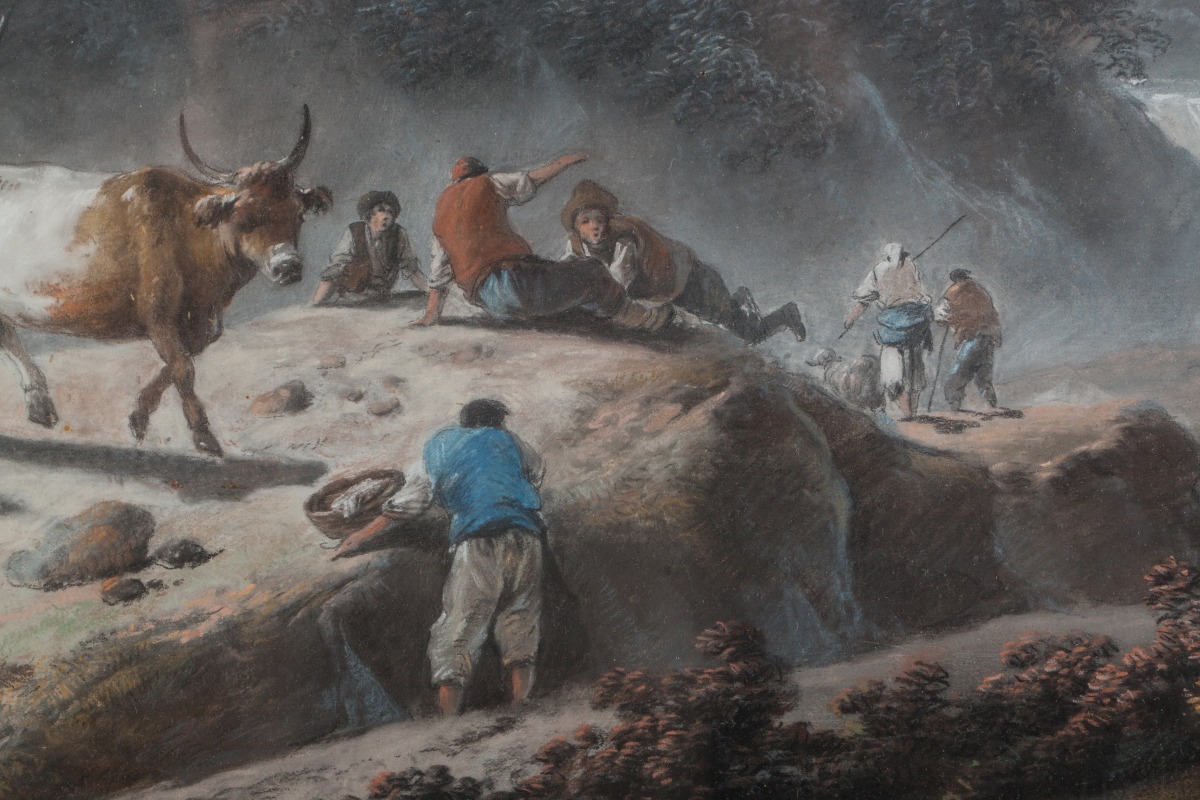 Jean Pillement se distingue par un double talent de paysagiste et de décorateur à l'aise avec les techniques les plus diverses: crayon, gouache, pastel, peinture à l'huile. Notre paire de paysages est un très bel exemple de Pillement comme paysagiste et pastelliste. Inspiré par les maître hollandais du XVIIème pour la composition, il utilise à merveille les couleurs des pastels pour égayer ses paysages et donner plus de vie à ses personnages.
