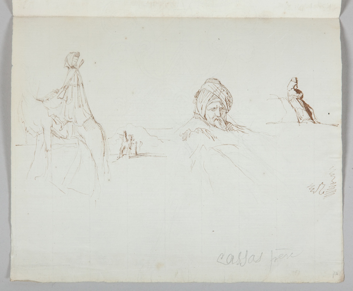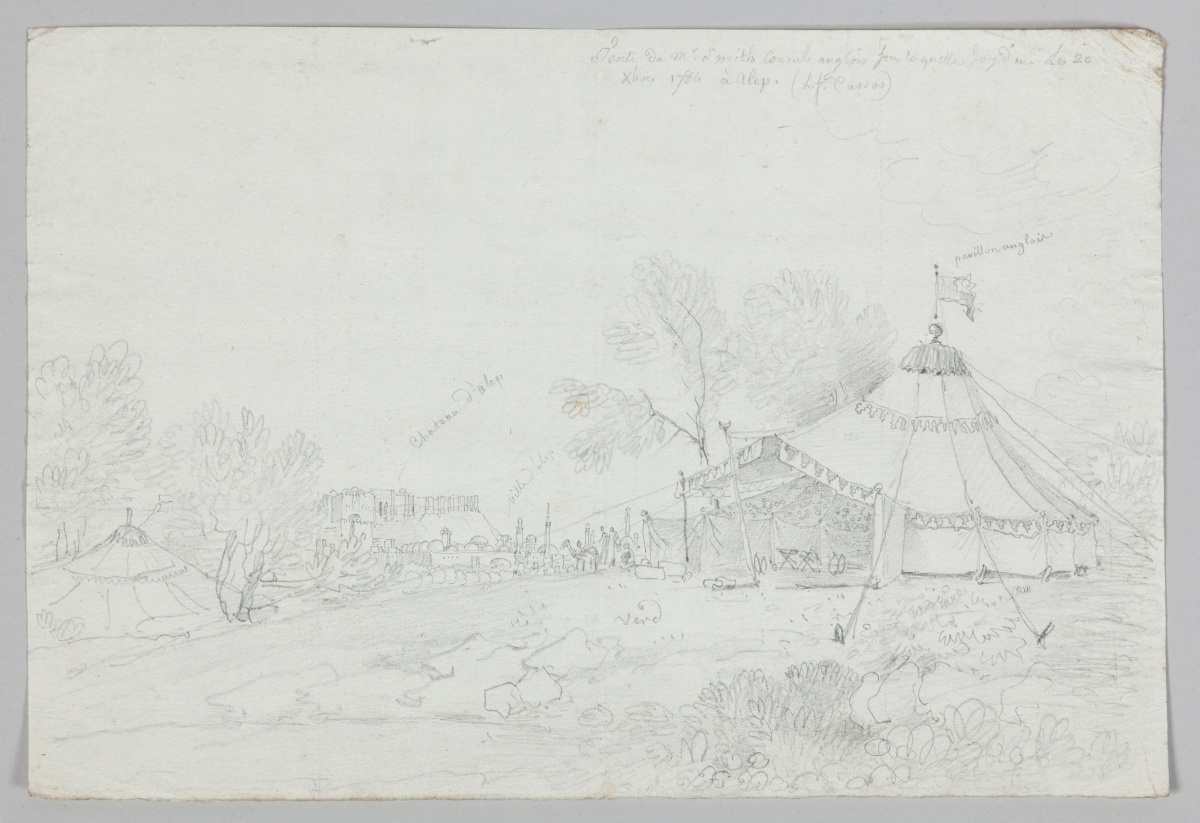 Légendé à la plume et encre noire sur traits de crayon noir en haut à droite: "Tente de Monsieur Smith, consul anglais, sous laquelle j 'ai dîné, le 20 décembre 1784 à Alep. (L.F.Cassas)" et au verso "porte d'Antioche (…) pour aller à Alep".