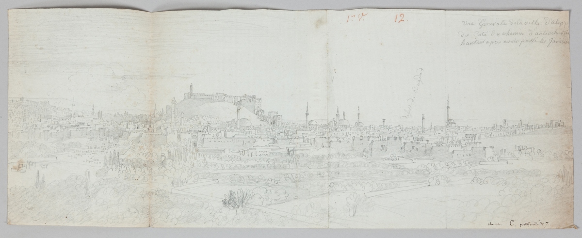 - "Vue générale de la ville d'Alep prise du côté du chemin d'Antioche sur la hauteur après avoir passé les jardins".