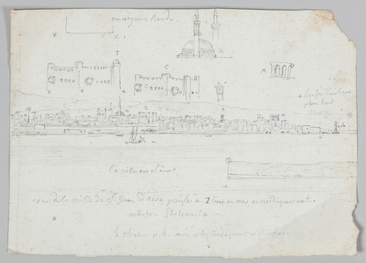 - Vue de la ville de Saint-Jean-d'Acre prise à Ilsiem (?) en mer, reprise dans le haut d'éléments architecturaux.