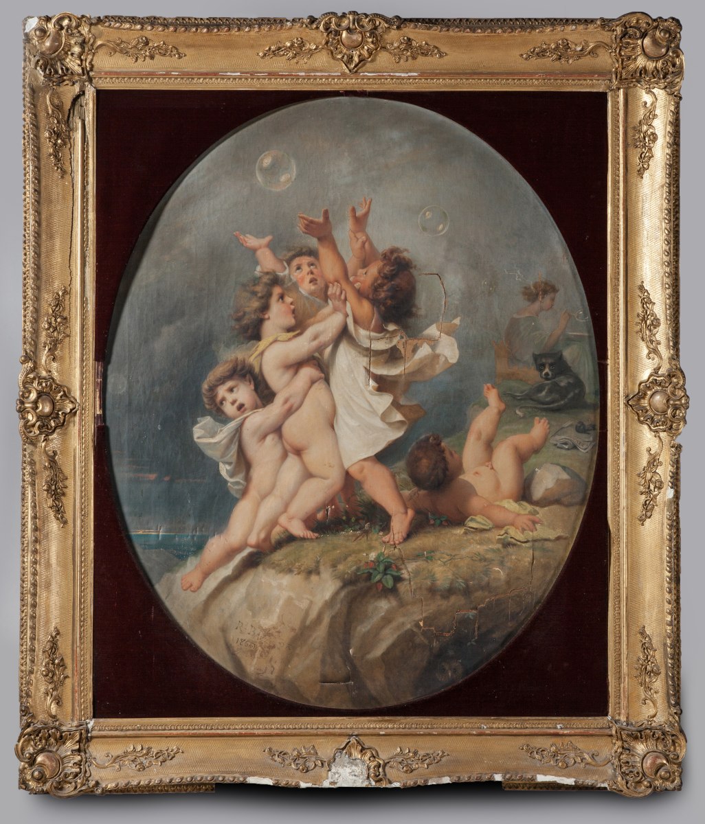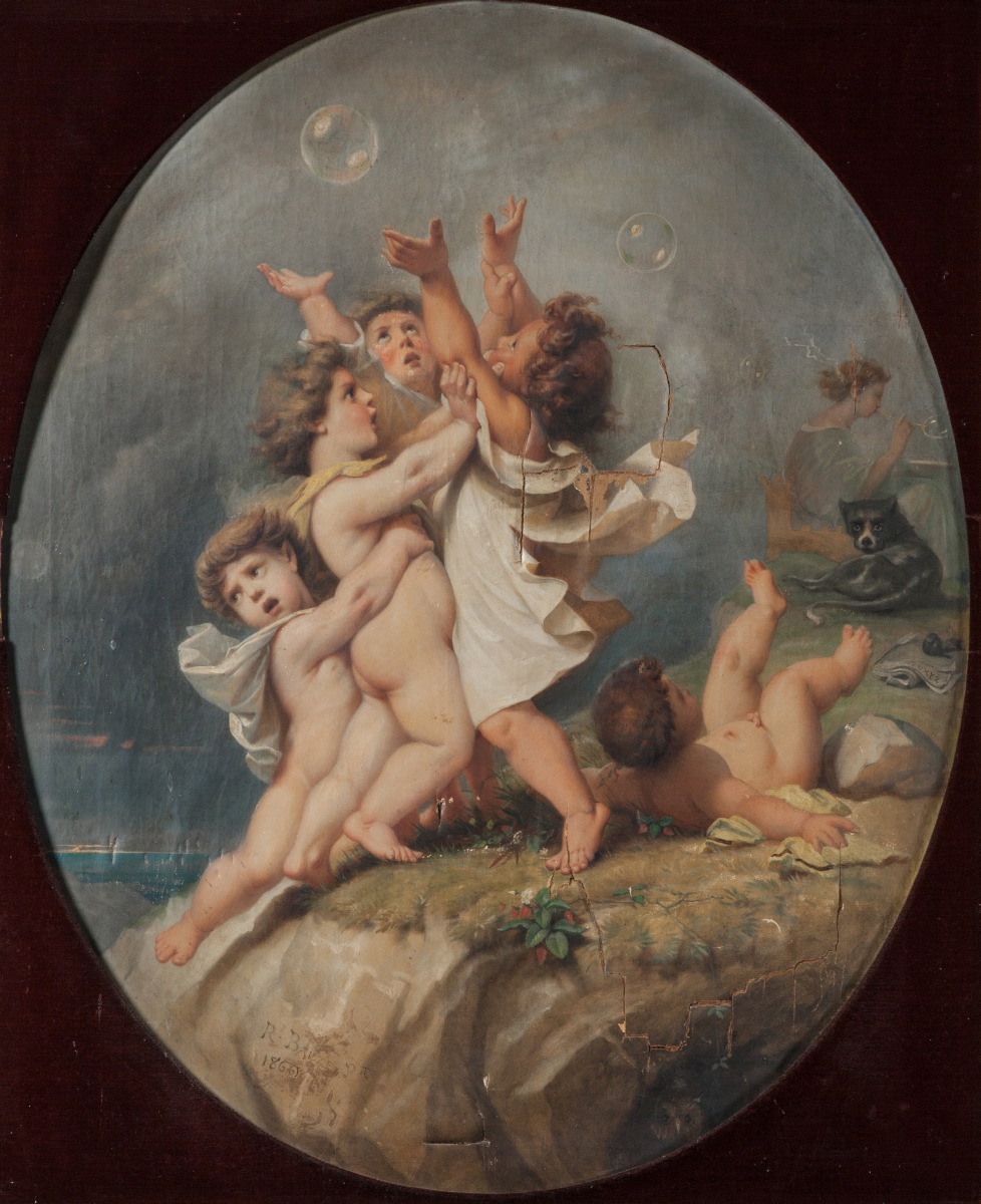 Notre tableau a été présenté par l'artiste au salon de 1867, sous le numéro 60, avec l'explication suivante "De jeunes enfants se disputent une bulle de savon qui les entraîne vers un précipice".