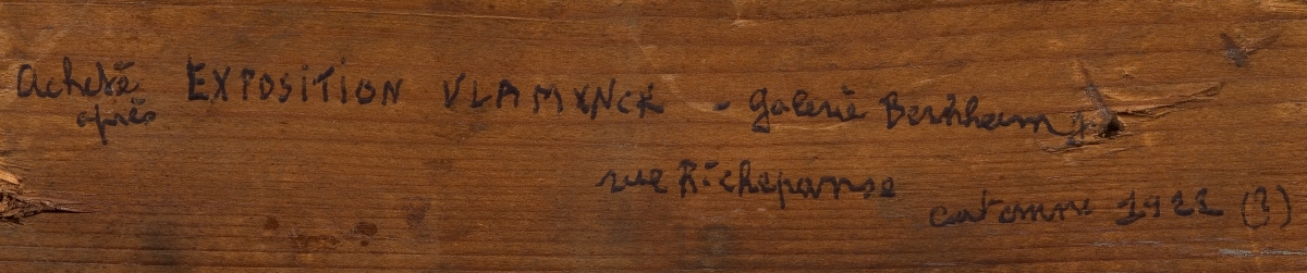 Inscription manuscrite sur le châssis: " achetée après Exposition Vlaminck - Galerie Bernheim - rue Richepanse autonome 1922 (?) ".