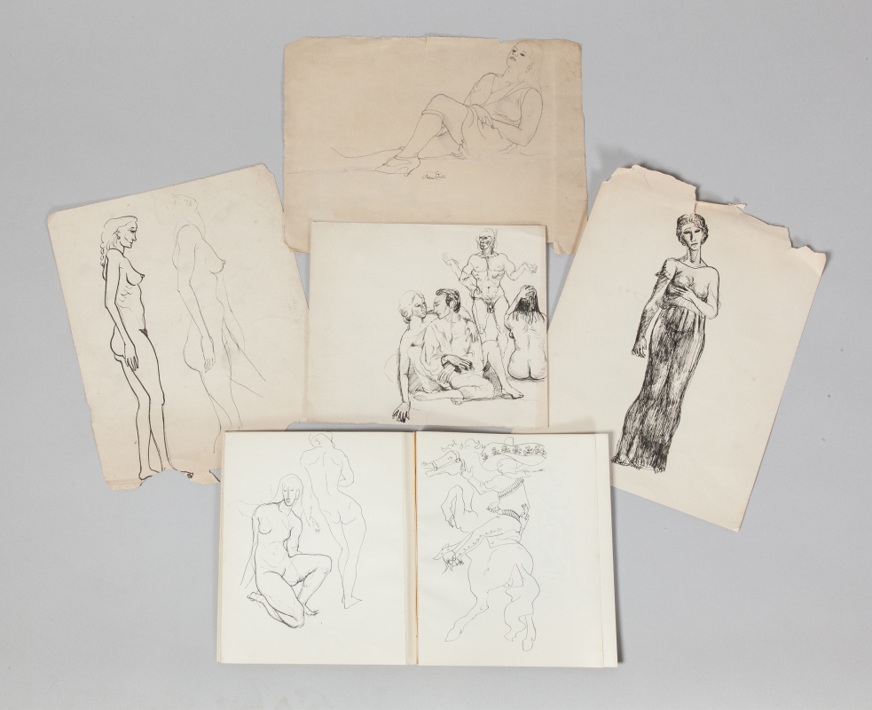 Cahier d'études comprenant environ 49 dessins sur des feuilles perforées: anatomies, personnages religieux, révolutionnaire mexicain. Un dessin signé