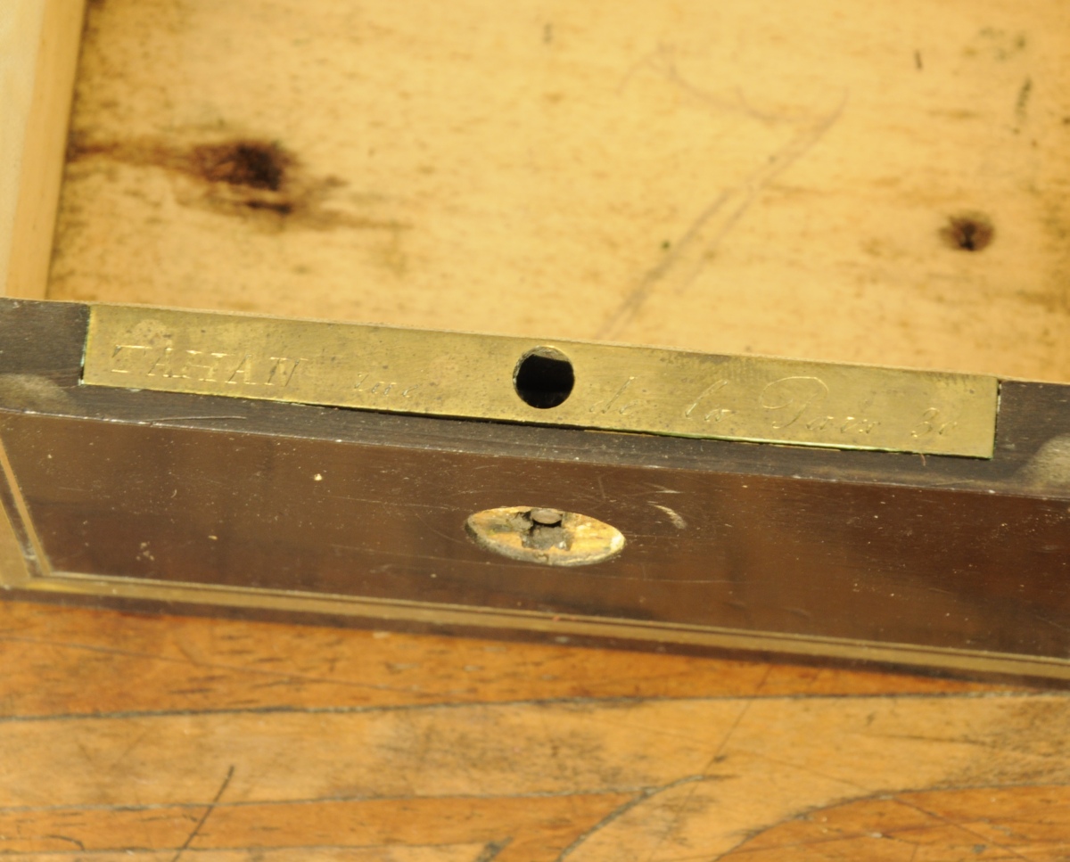 COFFRET en placage d'ébène à encadrement de filets en laiton; le couvercle est orné d'une miniature ovale de fleurs. Signé TAHAN à Paris.