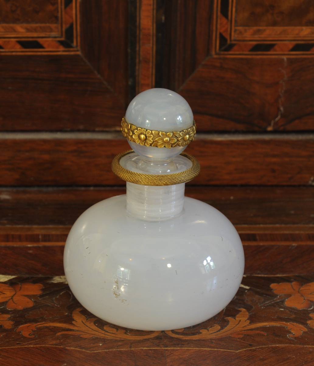 FLACON en opaline laiteuse, garniture en bronze ciselée de fleurs.