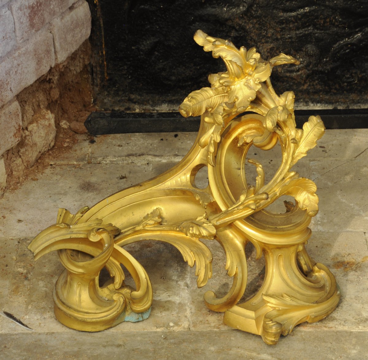 Paire de CHENETS en bronze ciselé et doré, décor rocaille de feuillages.