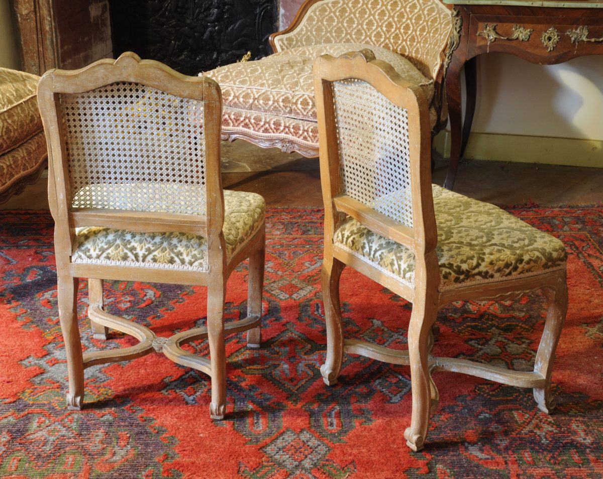 Paire de CHAISES en bois naturel mouluré, sculpté de coquille, rinceaux et de feuilles d'acanthe ; dossiers droits cannés, et pieds cambrés à enroulement, réunis par une entretoise en X.