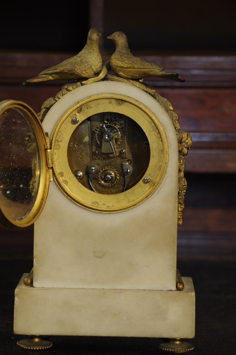 Petite PENDULE borne en albâtre et bronze doré surmontée de deux colombes. Cadran émaillé et cerclé de brillants.