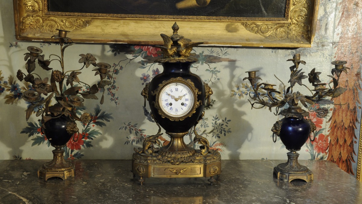 GARNITURE DE CHEMINÉE composée de vases en porcelaine à fond gros bleu à riches garnitures en bronze ciselé et doré. La pendule à cadran émaillé, surmonté d'un pot à feu et de colombes, anses à mufle de lion, piédouche sur une base à pans à frises de feuilles, de fleurs et feuilles d'acanthe. La paire de flambeaux à bouquet de lys formant cinq bras de lumière, piédouches feuillagés sur bases à pans.