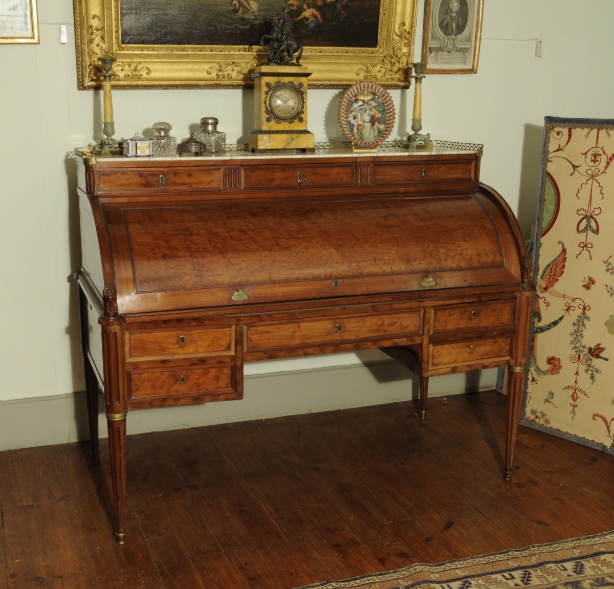 BUREAU À CYLINDRE en acajou et placage d'acajou moucheté, toutes faces. Montants moulurés et à cannelures sur pieds fuselés à cannelures. Il ouvre à un rang de trois tiroirs, à un cylindre découvrant un plateau coulissant et un rang de trois petits tiroirs, et à deux tablettes latérales et quatre tiroirs en ceinture. Dessus de marbre blanc à galerie en bronze doré.