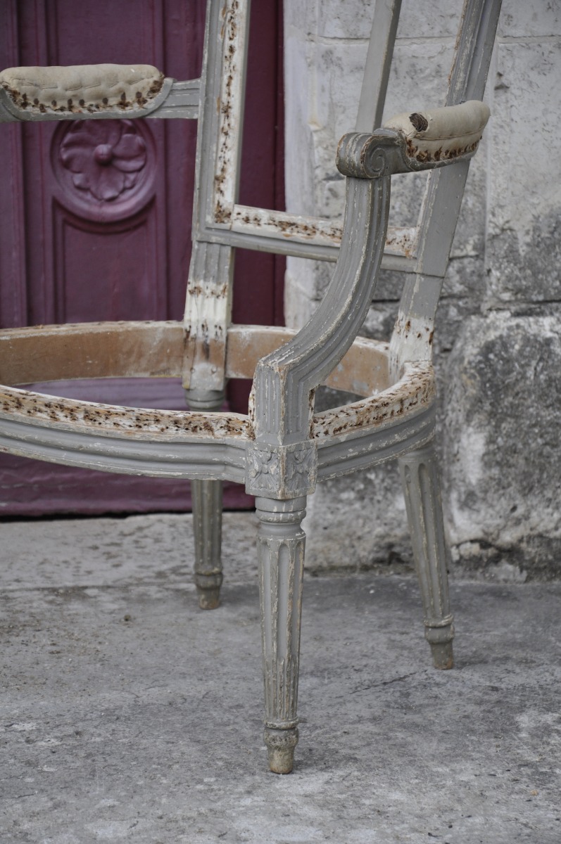 Paire de FAUTEUILS en bois mouluré et relaqué gris ; dossiers en cabriolet à anse de panier, accotoirs et pieds fuselés à cannelures rudentées.