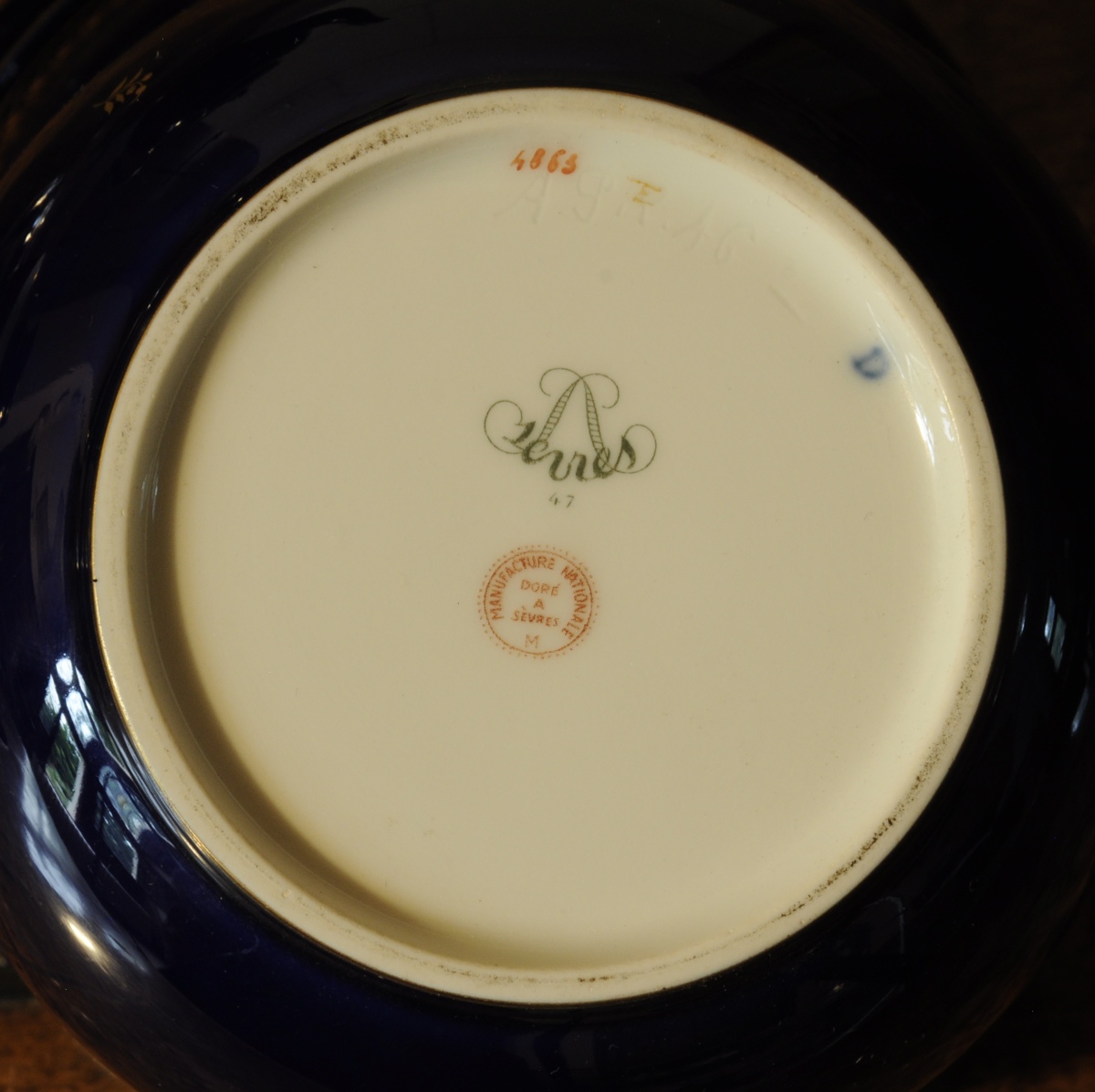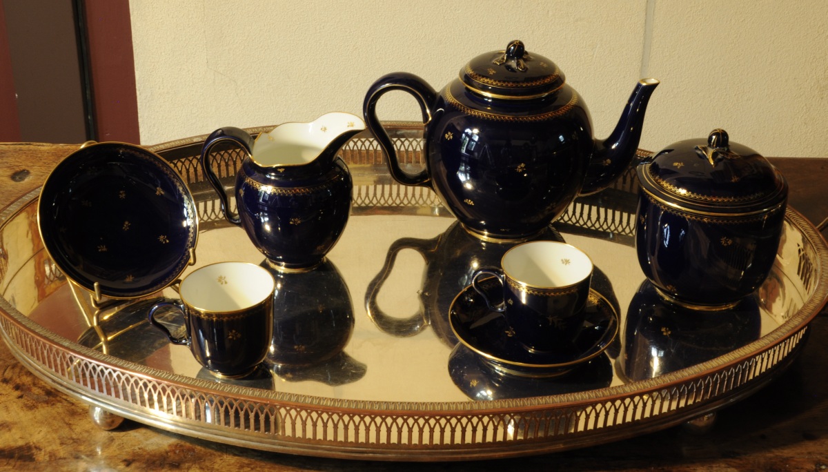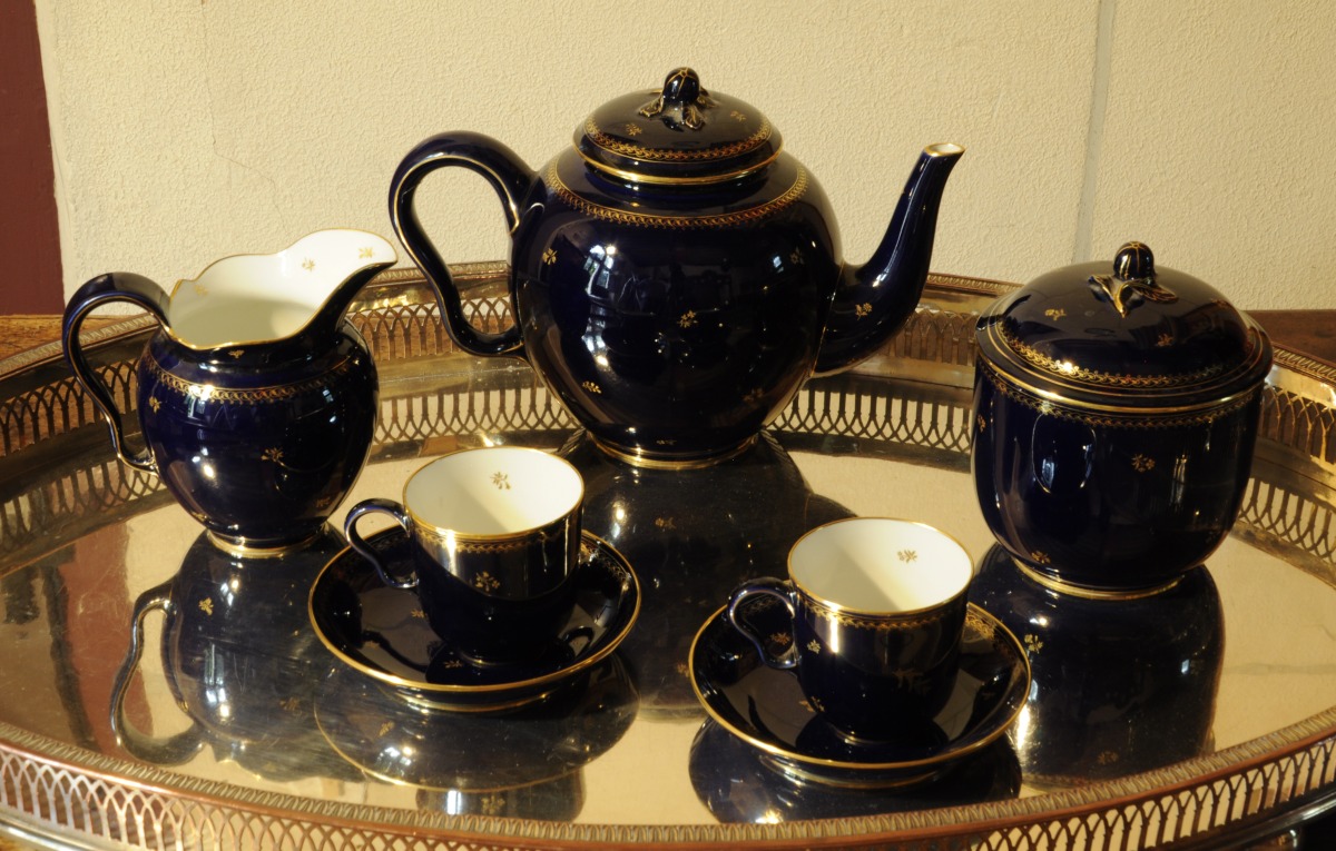 SERVICE à CAFÉ en porcelaine gros bleu et décor or de filets, frises et semis de feuillages. Il comprend: une verseuse, un sucrier couvert, un pot à eau, deux tasses et soucoupes.