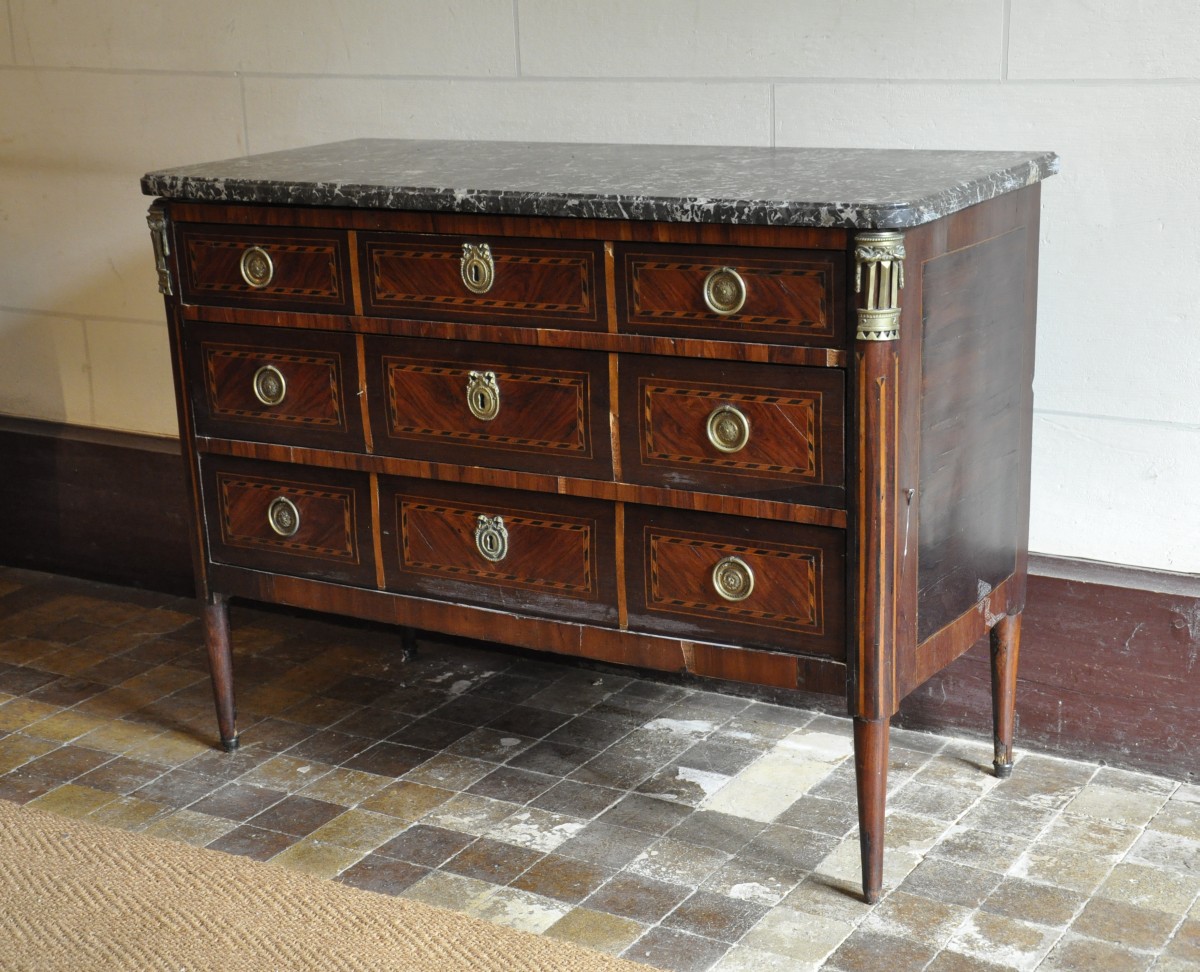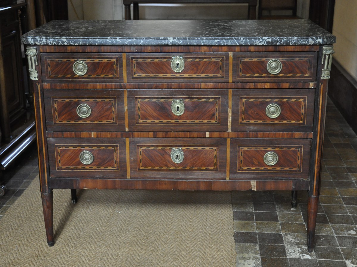 COMMODE en bois de placage marqueté en feuilles et ailes de papillon dans des encadrements à filets torsadé; montants en arrondi sur pieds fuselés à fausses cannelures. Elle ouvre à trois rangs de tiroir. Garniture de bronze: anneaux, chutes et sabots. Dessus de marbre gris Ste Anne.