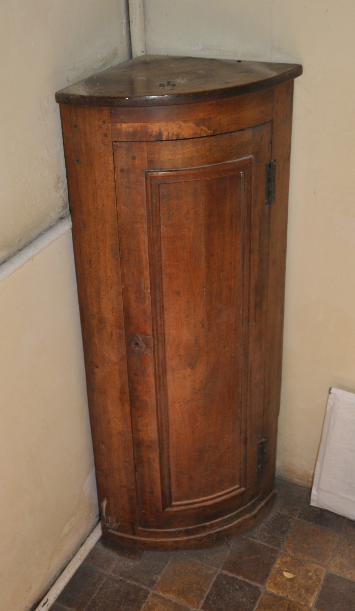ENCOIGNURE en bois naturel, façade en arrondi, ouvrant à une porte moulurée.
