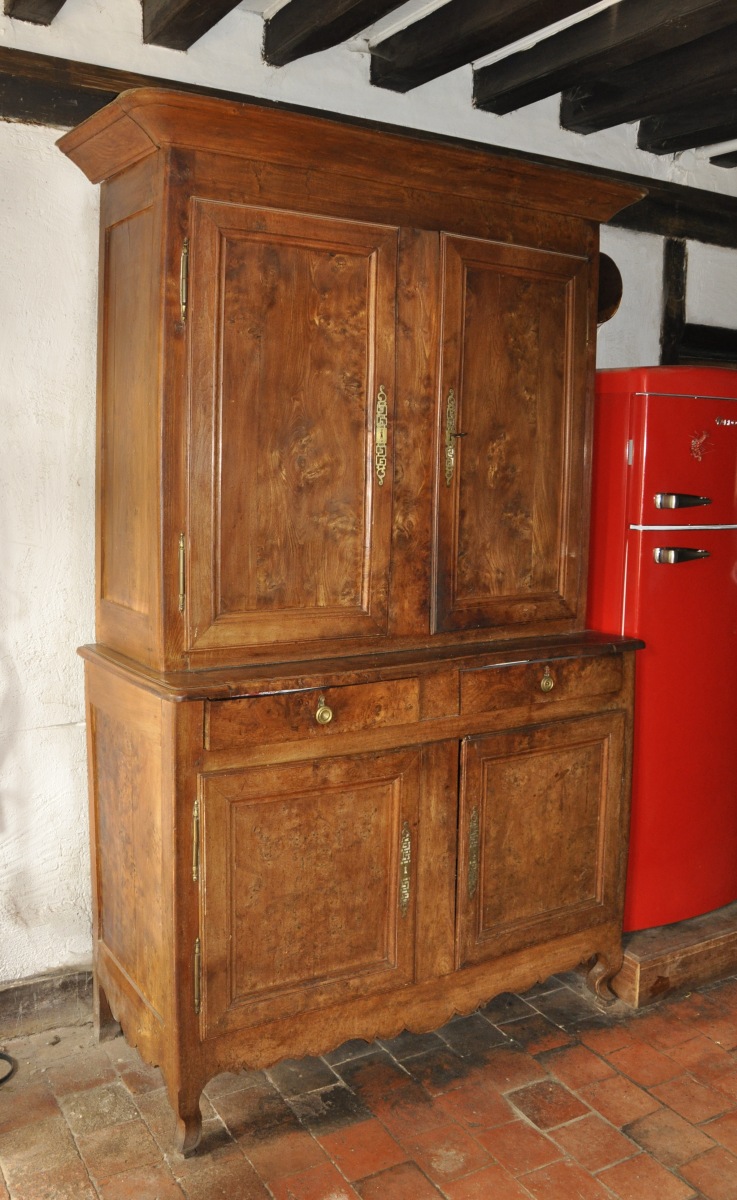 BUFFET DEUX CORPS en bois naturel et loupe d'orme ; montants droits sur petits pieds cambrés réunis par une traverse découpée. Il ouvre à quatre portes et deux tiroirs.