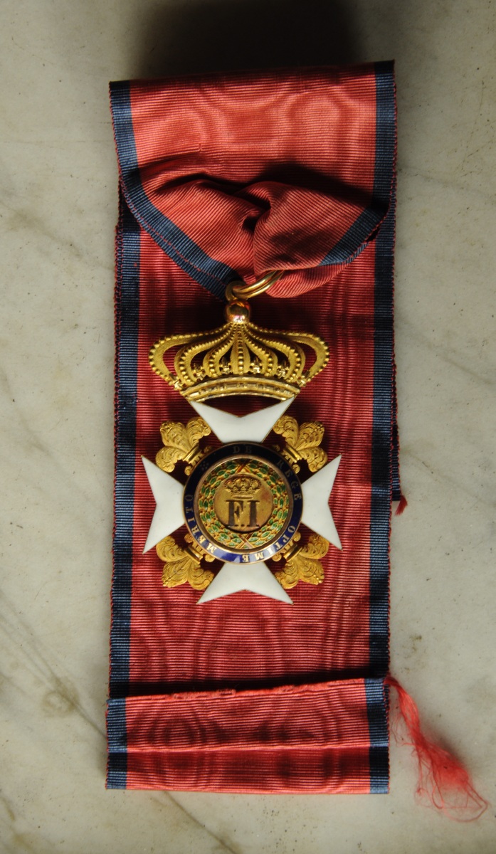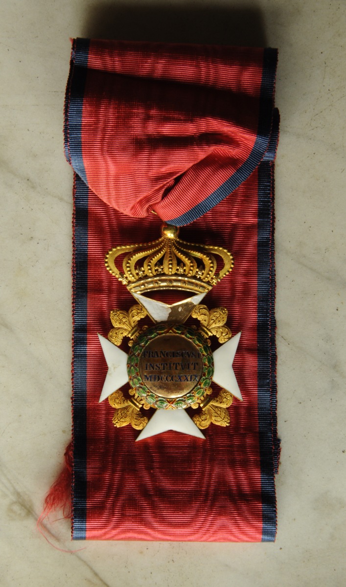 Royaume des Deux-Siciles - ORDRE ROYAL DE FRANÇOIS Ier, fondé en 1829, croix de commandeur en or ciselé, partiellement bruni et amati, et émail (un éclat avec manque à l'émail blanc au revers de la branche supérieure), les centres en plusieurs parties, sommée d'une large couronne fixe avec un double anneau de suspension, longue cravate non montée. Remarquable fabrication napolitaine.