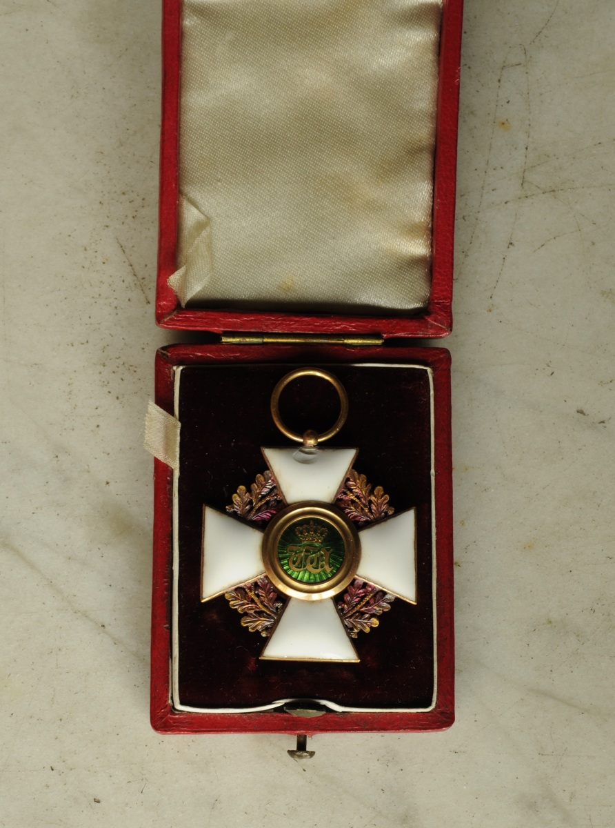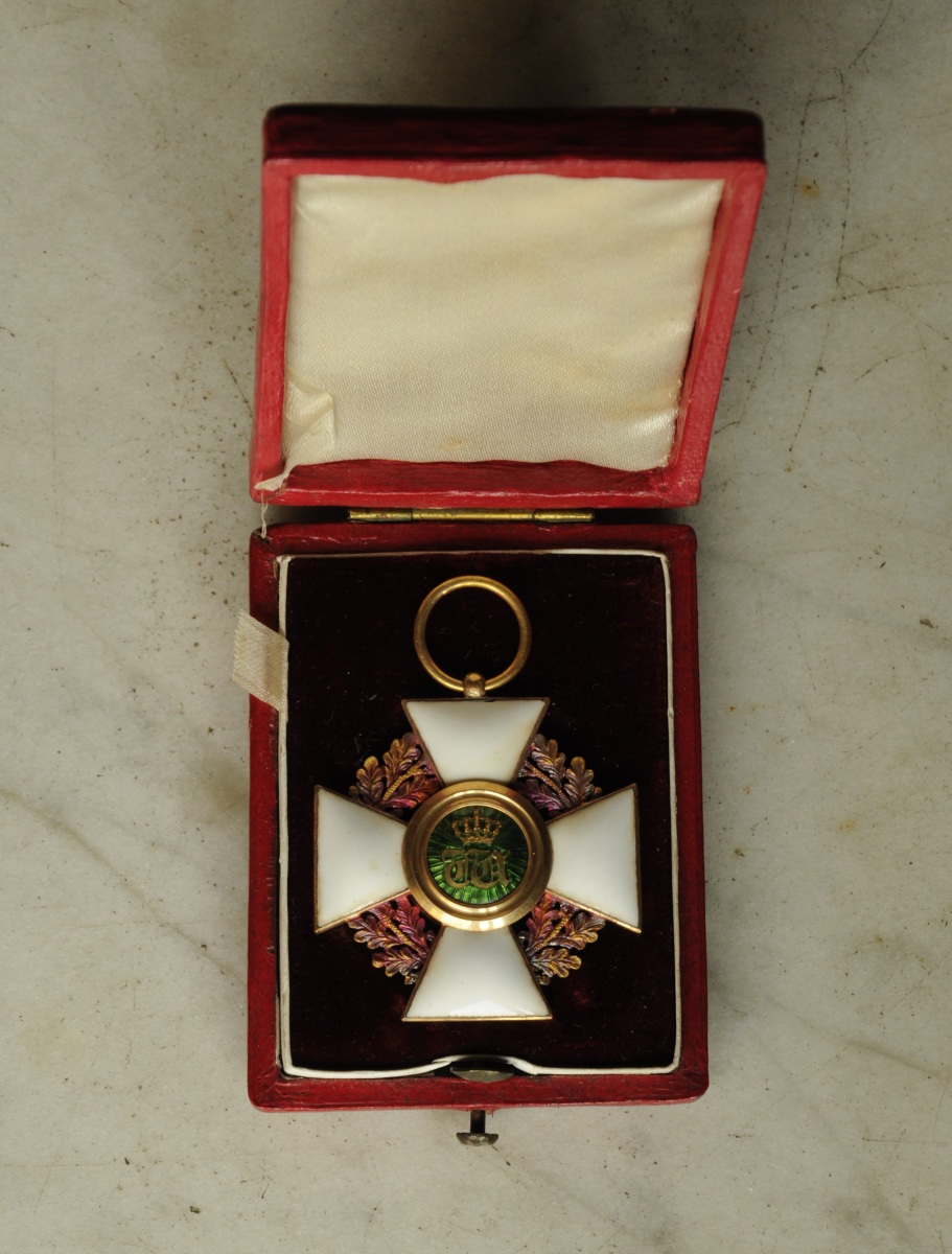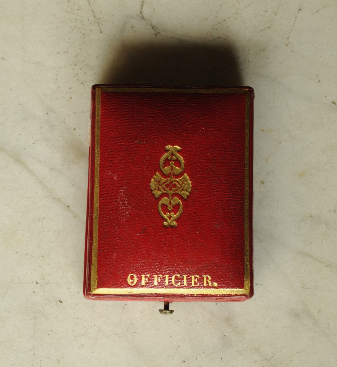 Grand-Duché du Luxembourg - ORDRE DE LA COURONNE DE CHÊNE, fondé en 1841, croix d'officier en or et émail (petit éclat sous la bélière au revers), dans son écrin en maroquin rouge, le couvercle orné de filets et d'un motif décoratif surmontant le nom du grade. Créé en 1858, le grade d'officier reprend la croix de chevalier en y ajoutant une couronne de chêne entre les bras de la croix. Insigne datant de la création du grade.