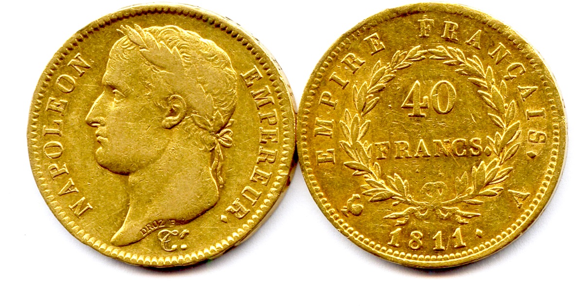Lot de deux pièces 40 Francs Napoléon Ier (tête laurée) 1810 Lille et 1811 Paris. T.B.