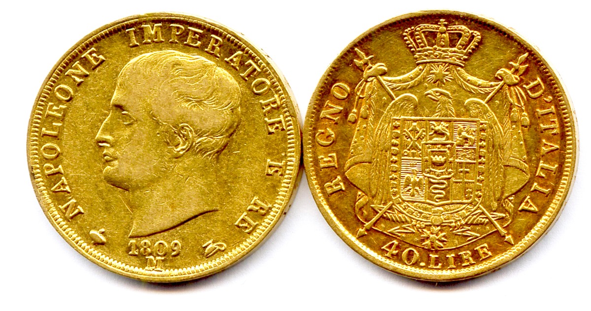 Lot de deux pièces 40 Lire Napoléon Ier empereur et roi d'Italie 1809 et 1814 Milan. T.B/Très beaux.