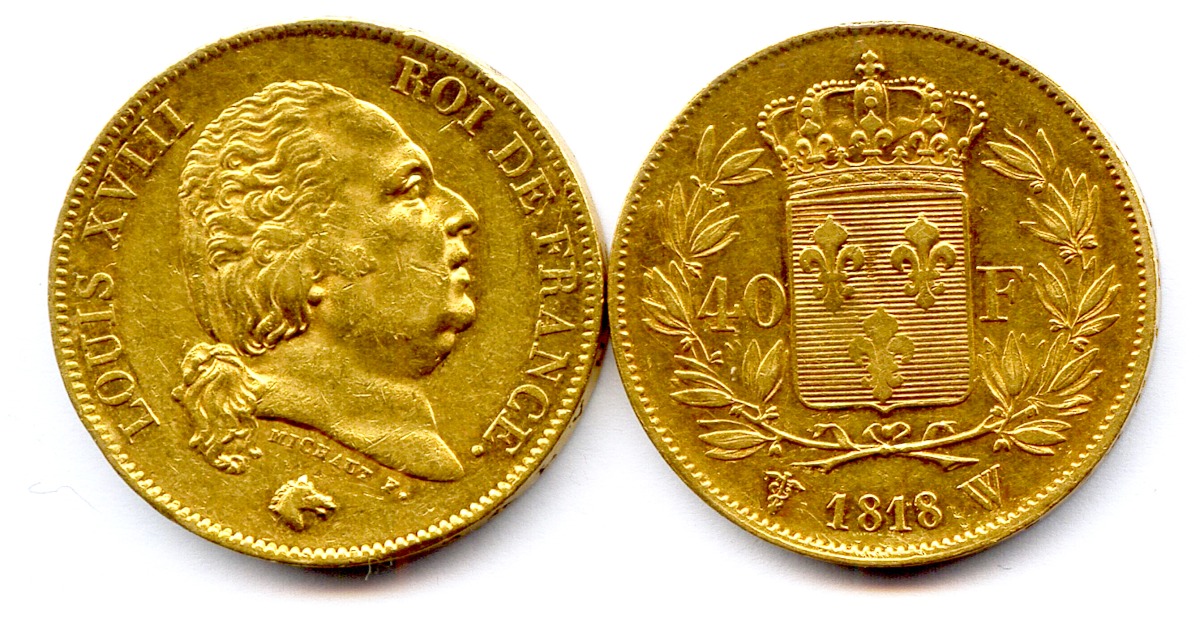 Lot de deux pièces 40 Francs Louis XVIII 1816 Bayonne et 1818 Lille. TB.