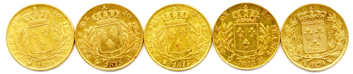 Lot de cinq pièces 20 Francs or Louis XVIII: (buste habillé) 1814 Paris, 1815 Paris, 1815 Perpignan et 1815 Londres, (tête nue) 1824 Lille. T.B. Très beaux.