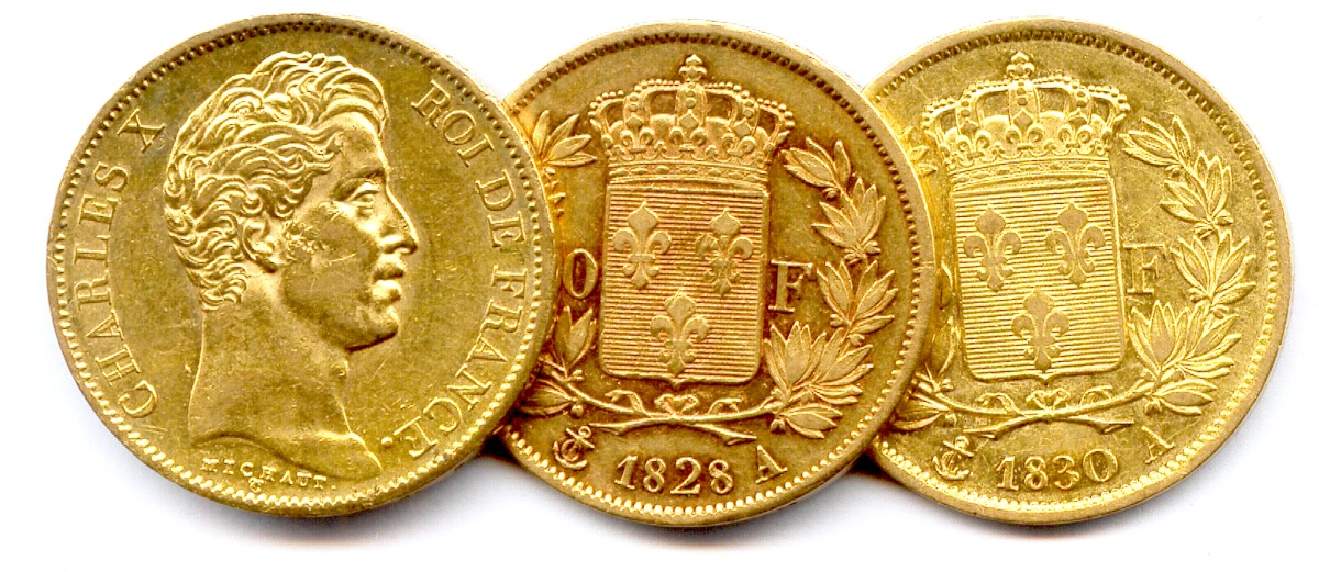 Lot de trois pièces 40 Francs Charles X 1828 Paris (2 ex.) et 1830 Paris. T.B.