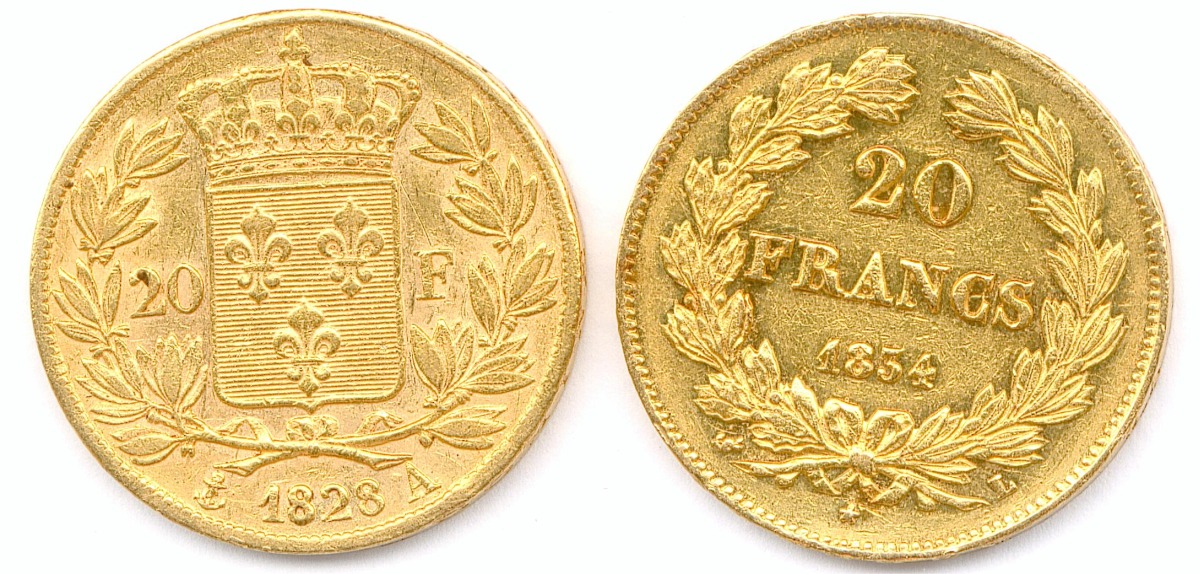 Lot de deux pièces de 20 Francs or: Charles X 1828 Paris et Louis Philippe 1834 Bayonne. Très beaux.