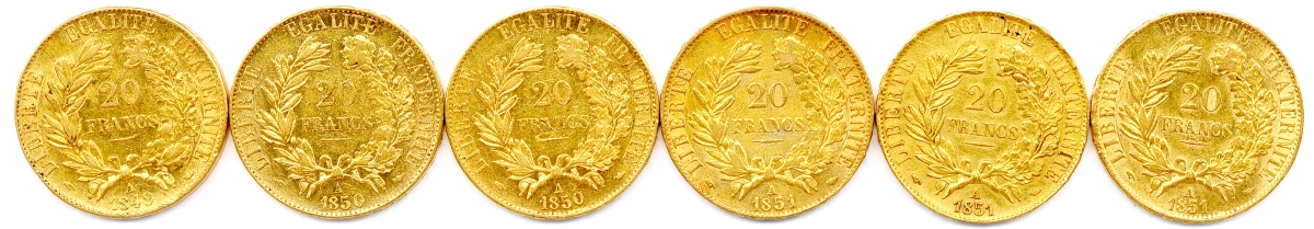 Lot de six pièces 20 francs or IIe République (type Cérès): 1849 Paris, 1850 Paris (2 ex.) et 1851 Paris (3 ex.). T.B. Très beaux et Superbe.