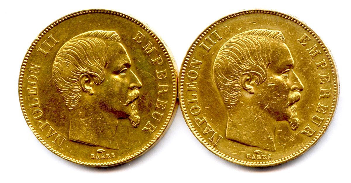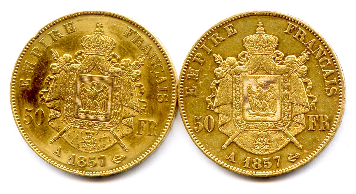 Lot de deux pièces 50 Francs Napoléon III (tête nue) 1857 Paris.