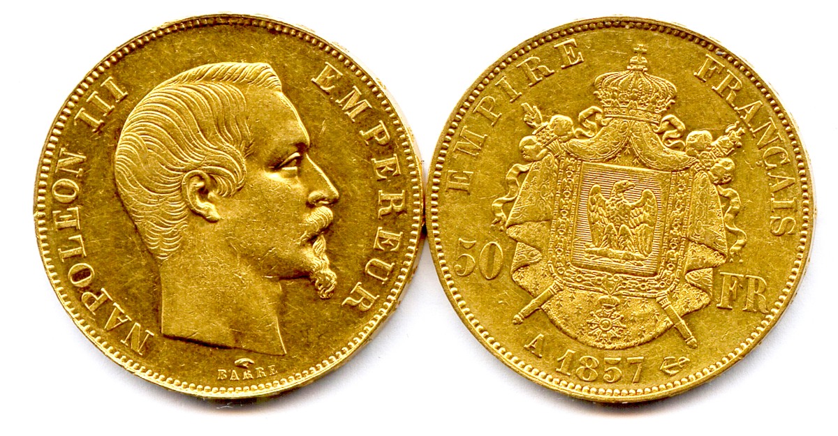 Lot de deux pièces 50 Francs Napoléon III (tête nue) 1857 Paris. TB.