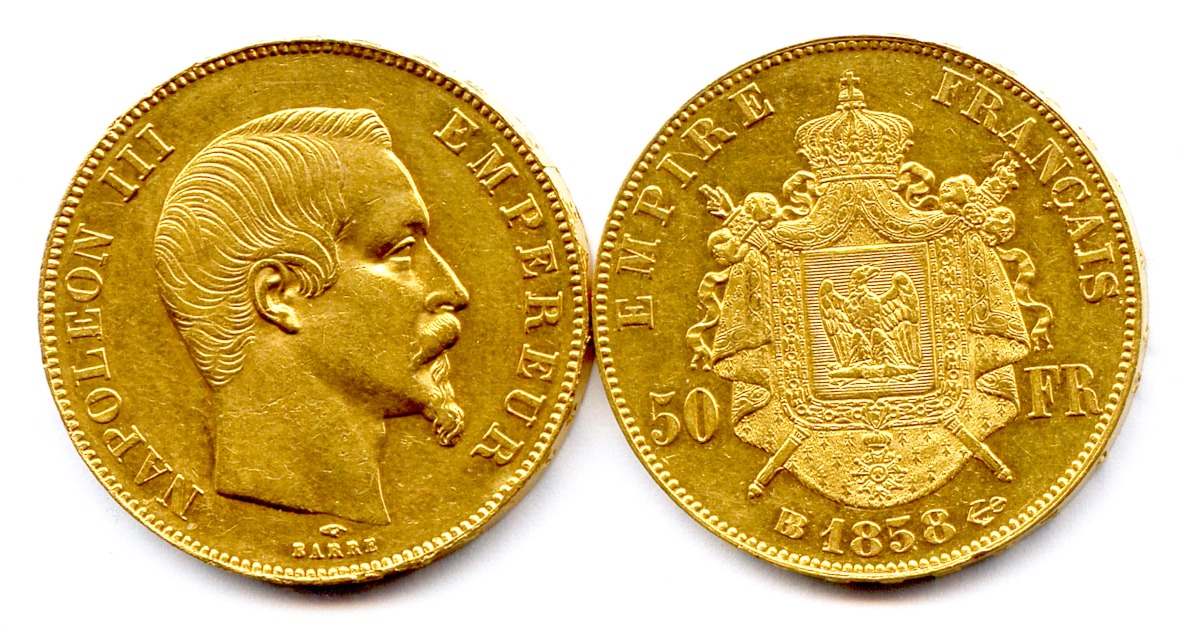 Lot de deux pièces 50 Francs Napoléon III (tête nue) 1858 Paris et Strasbourg. T.B.