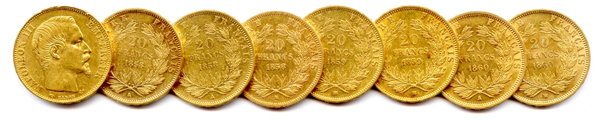 Lot de huit pièces 20 Francs Napoléon III (tête nue) 1858 Paris (3 ex.), 1858 Strasbourg, 1859 Strasbourg (2 ex.), 1860 Paris et 1860 Strasbourg.