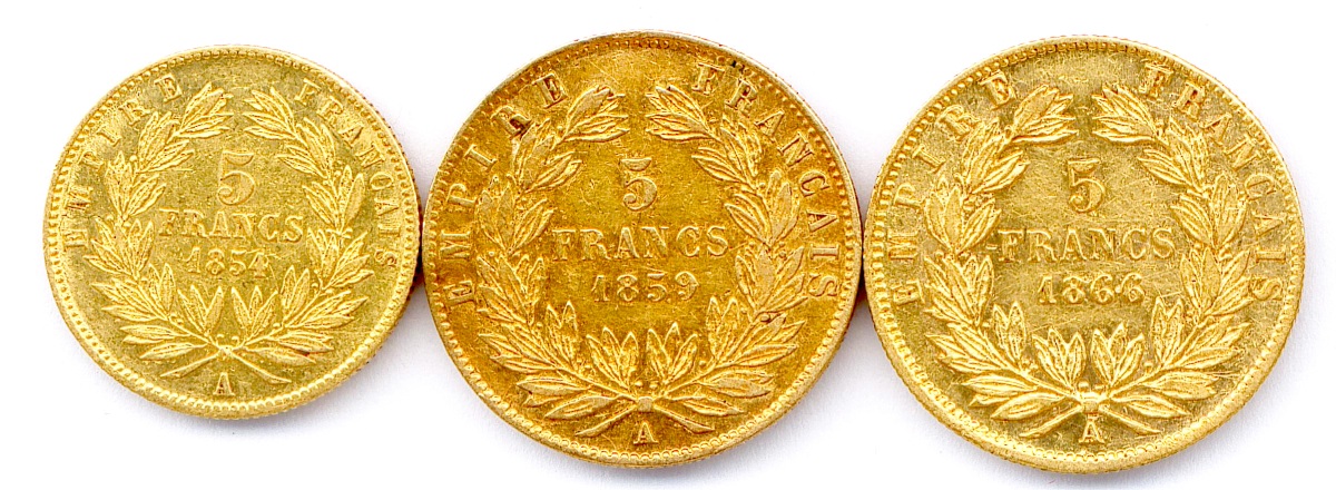 5 Francs (petit module tranche striée) 1854 Paris, 5 Francs (tête nue) 1859 Paris et 5 francs (tête laurée) 1866 Paris.