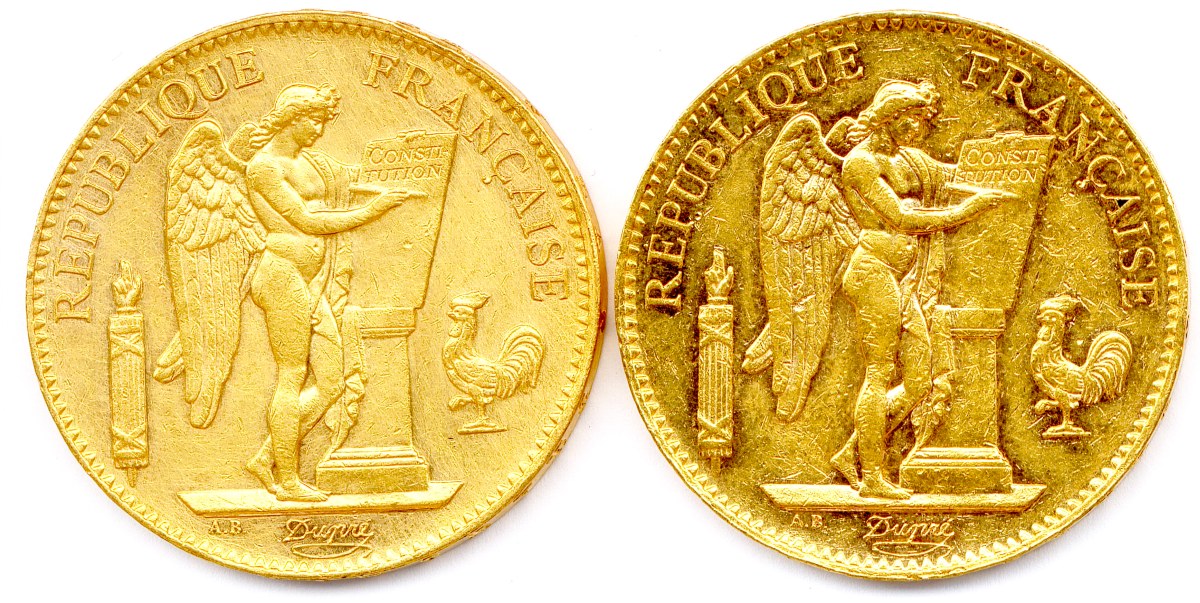 Lot de deux pièces IIIe République: 100 Francs or (Dieu protège la France) 1904 et 1905 Paris. Très beaux.